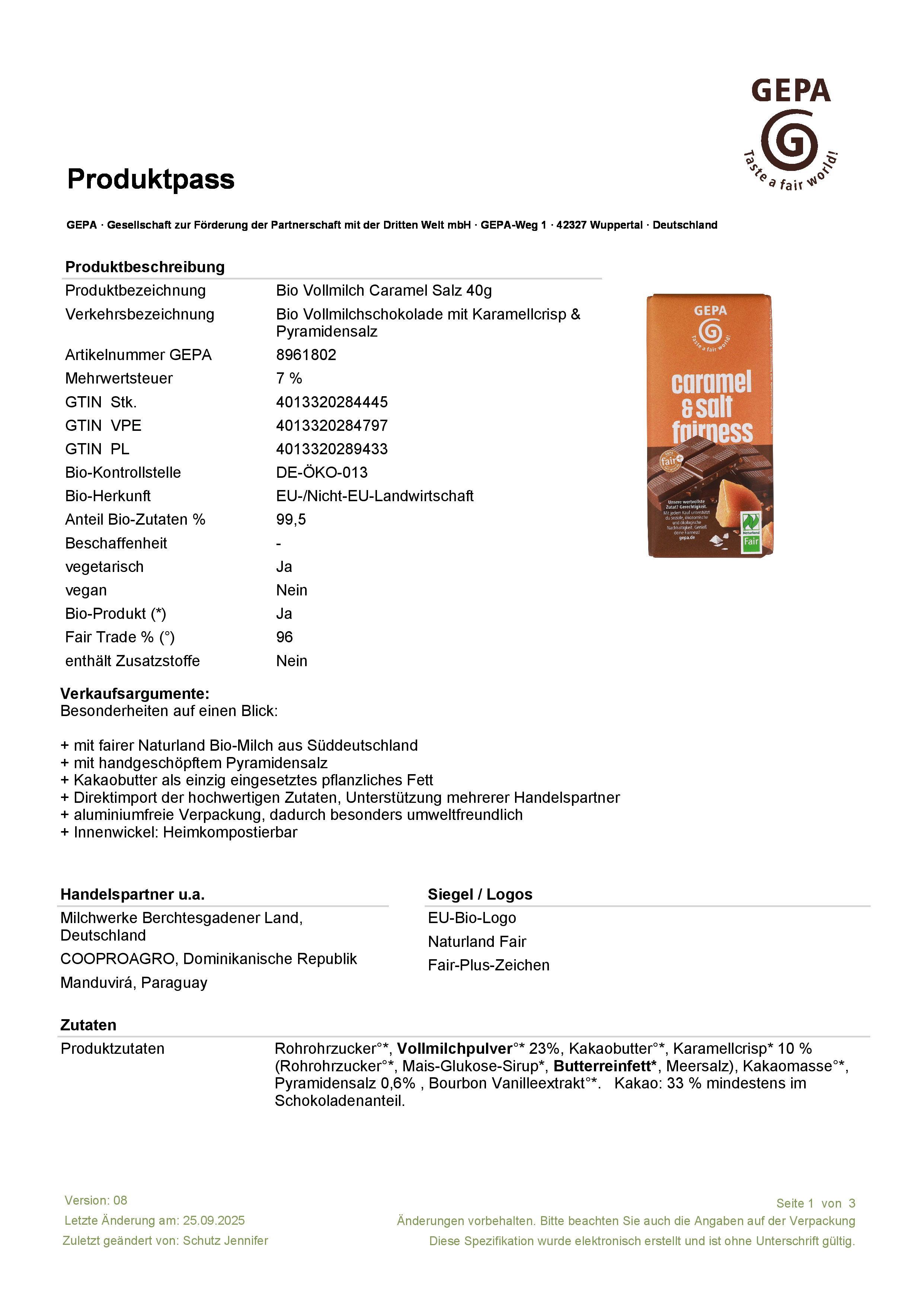 ZutatenRohrohrzucker°*, VOLLMILCHPULVER°*, 23 % Kakaobutter°*, Butterkaramellcrisp* 10 % (Rohrohrzucker°*, Mais-Glukose-Sirup*, BUTTERREINFETT*, Meersalz), Kakaomasse°*, HASELNUSSPASTE*, Pyramidensalz, Vanilleextrakt°*. Kakao: mindestens 33%