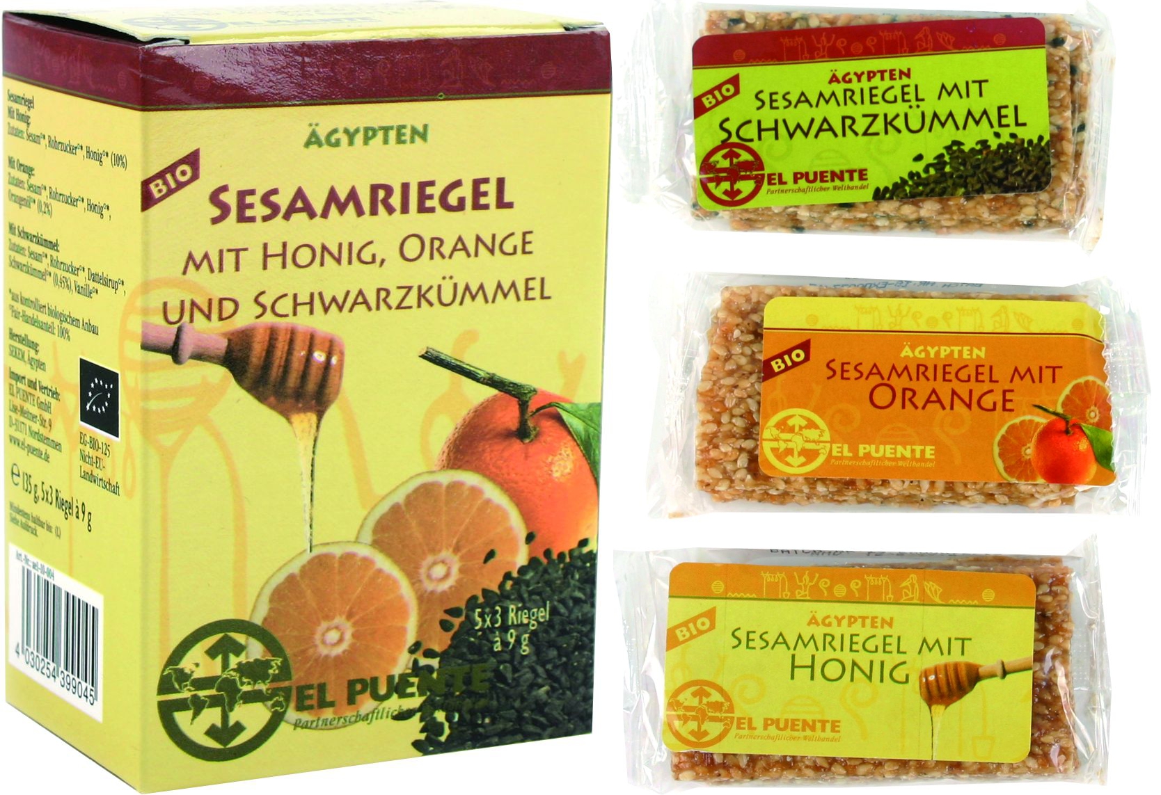 5 x 3 Riegel à 9 g, Geschmacksrichtungen Orange, Schwarzkümmel und Honig, kbA