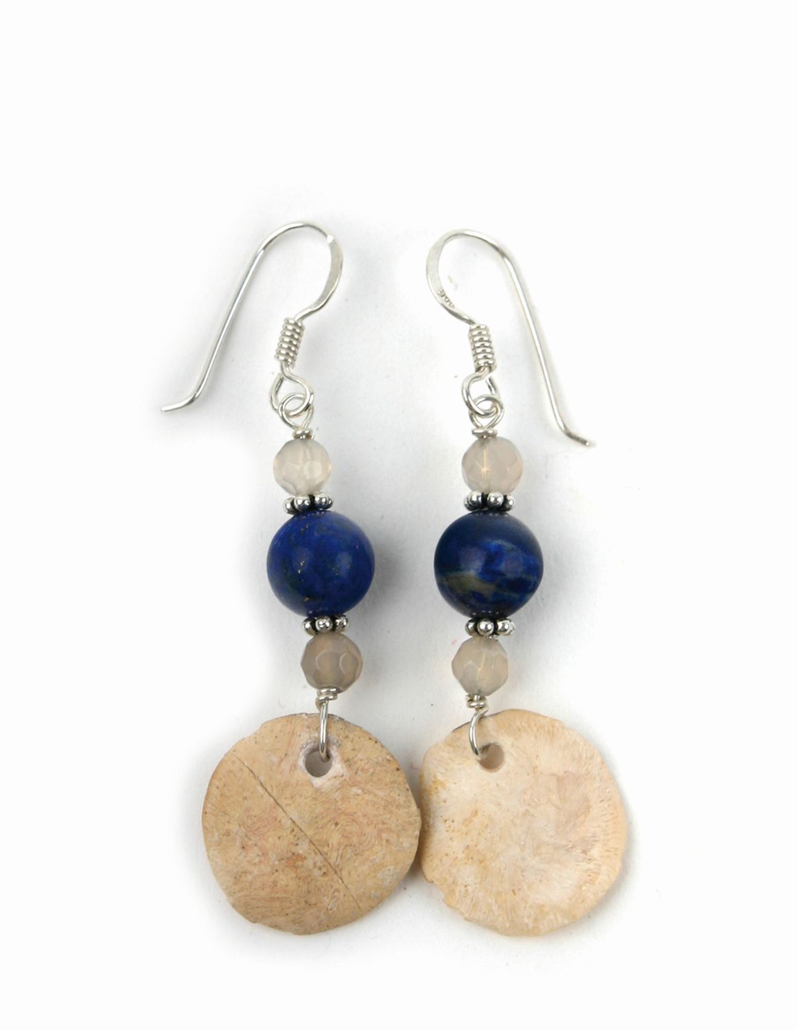 InfozeileNummulit mit Lapislazuli und Achat, Bügel aus galvanisiertem Messing, L ca. 5 cm, in goldenem Organza-Beutelchen