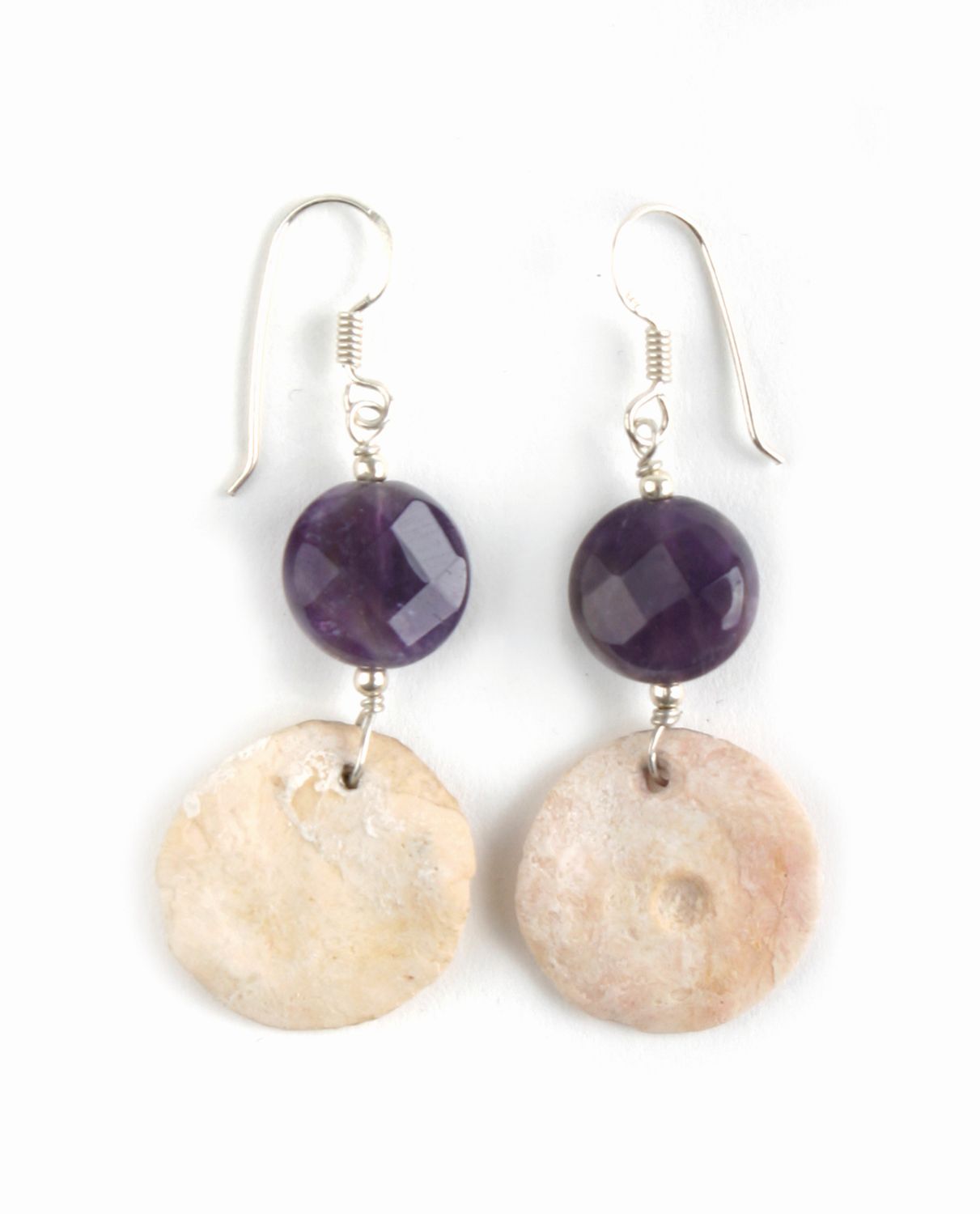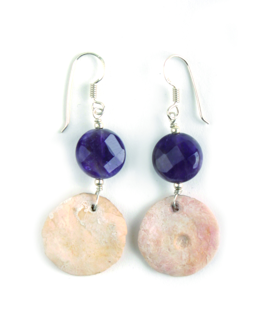 Nummulit mit Amethyst, Bügel aus galvanisiertem Messing, L ca. 5 cm, in goldenem Organza-Beutelchen