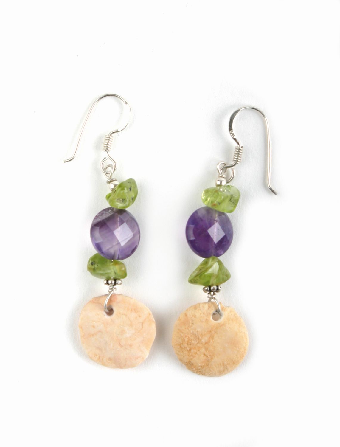 InfozeileNummulit mit Peridot und Amethyst, Bügel aus galvanisiertem Messing, L ca. 5 cm, in goldenem Organza-Beutelchen