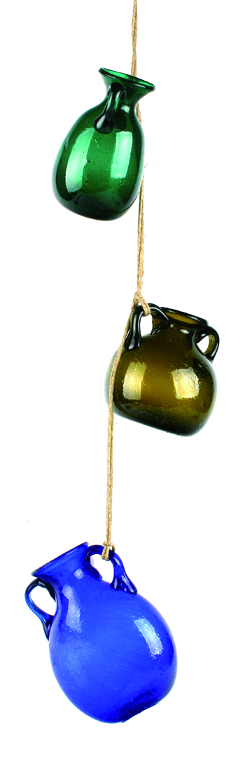 Infozeilean Kordel aufgehangen, recyceltes Glas, dunkelblau, grün und olivgrün, 15 x 11 cm, 10 x 9 cm, 11 x 7 cm