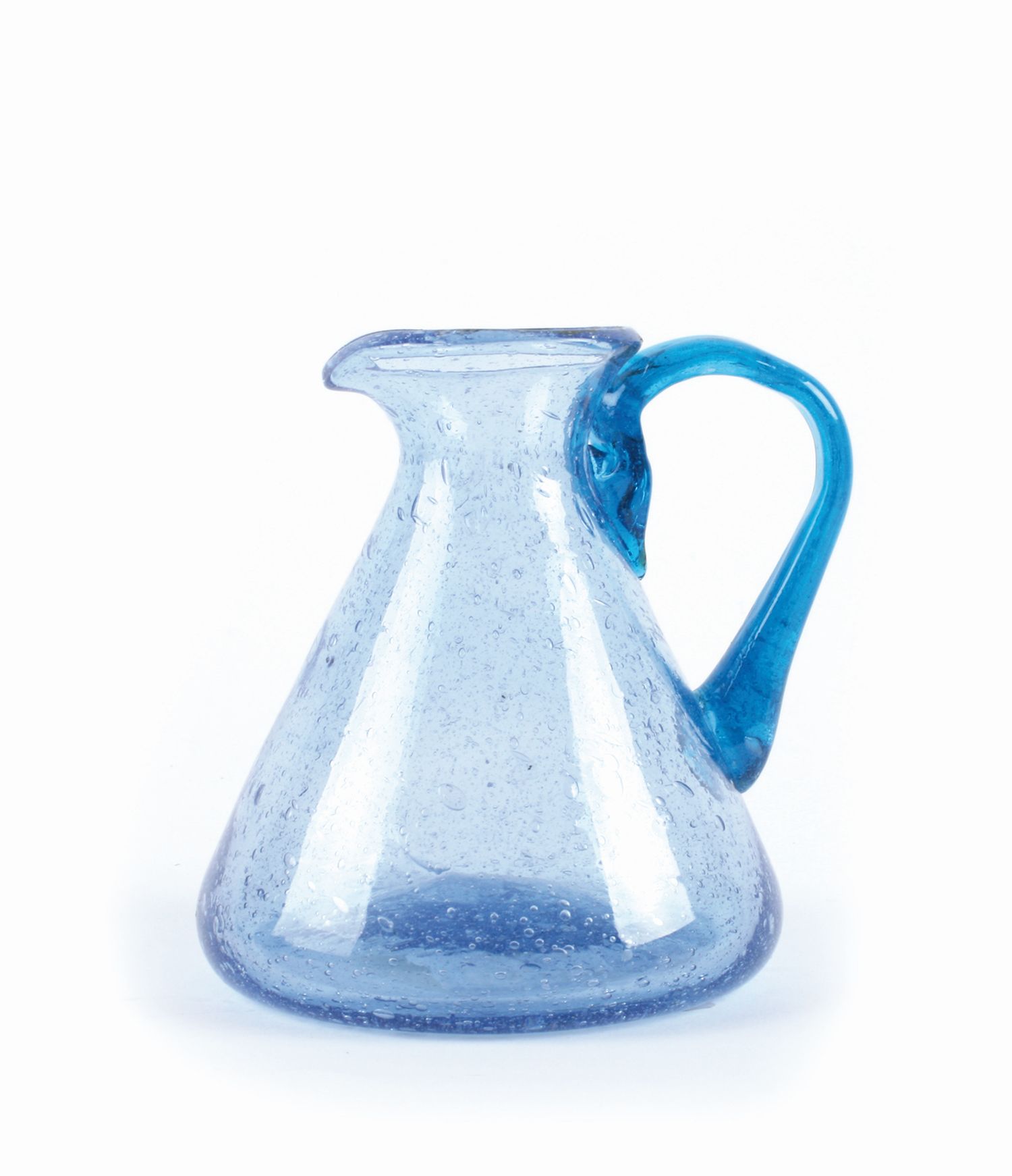 Infozeilerecyceltes Glas, blau mit türkisen Henkel, kolbenförmig, H 25 cm, Ø 15 cm, geeignet für die Spülmaschine