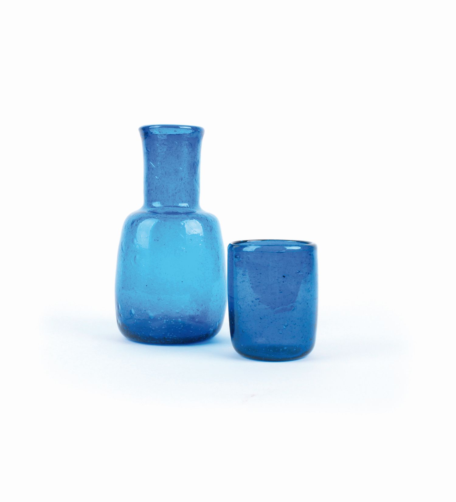 Infozeilerecyceltes Glas, 2-teilig, türkis, Karaffe: H 18,5 cm, Ø 9 cm, Glas: H 8 cm, Ø 6,5 cm, geeignet für die Spülmaschine