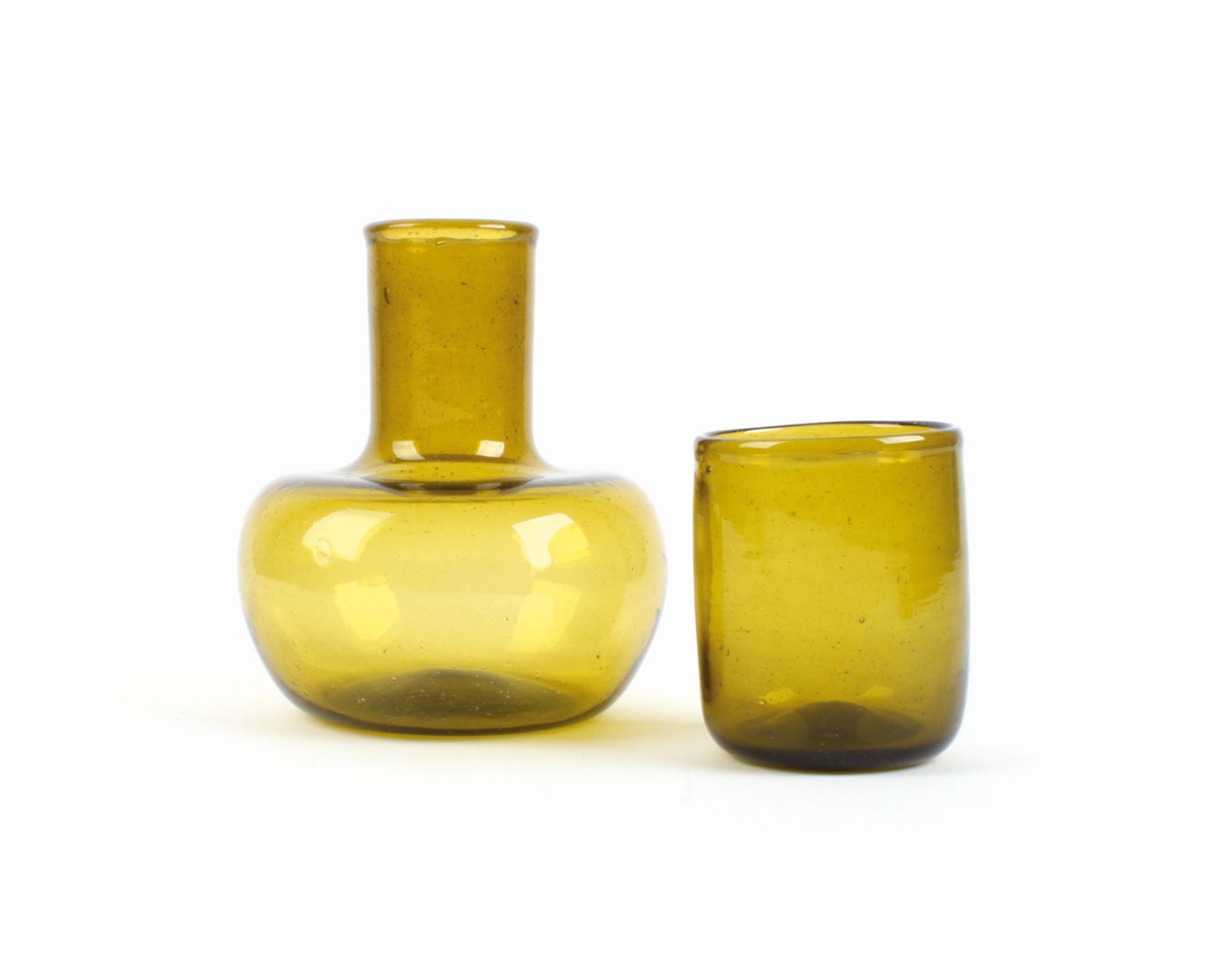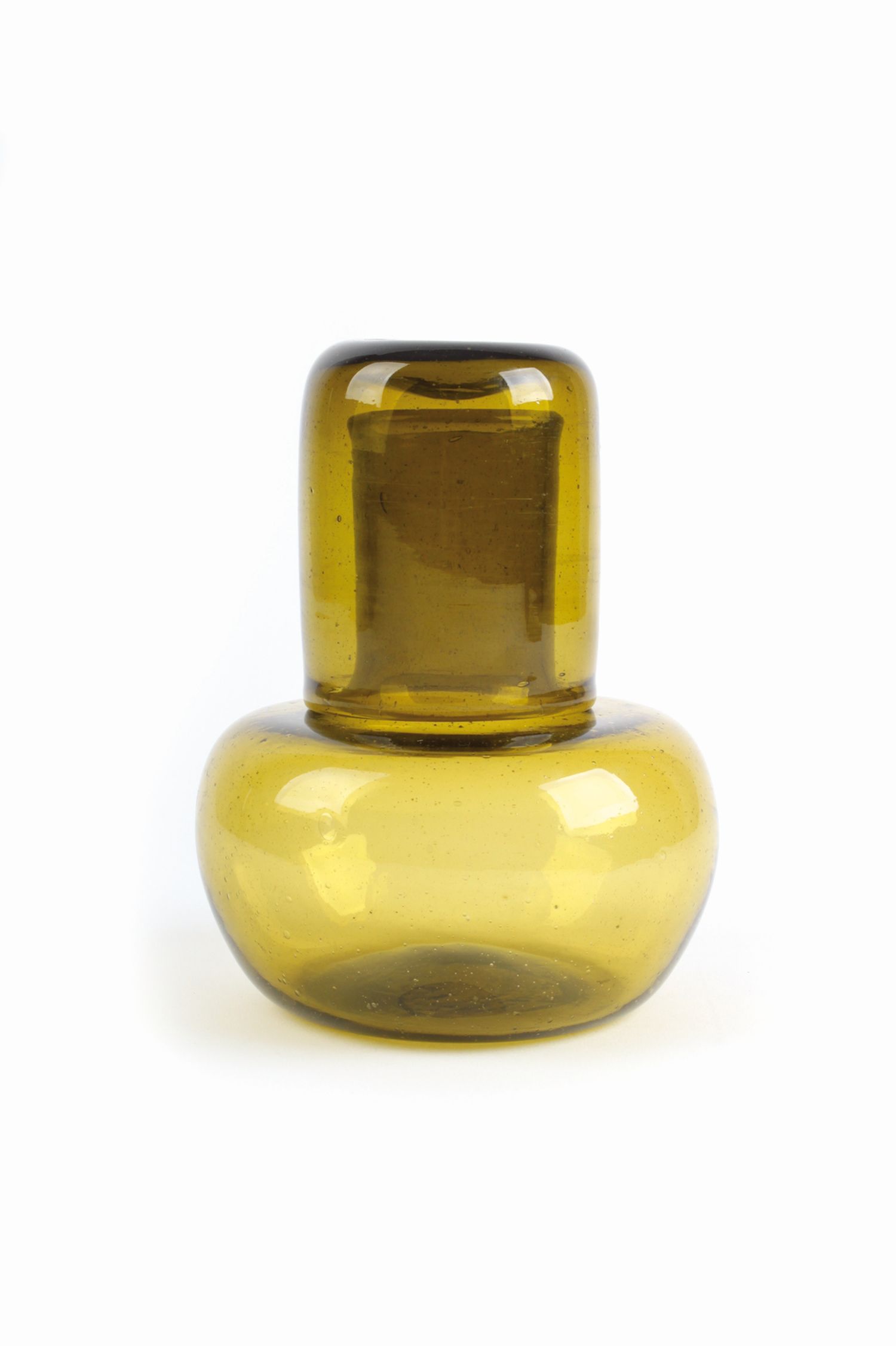 Infozeilerecyceltes Glas, 2-teilig, olivgrün, Karaffe: H 16 cm, Ø 12 cm, Glas: H 8 cm, Ø 6,5 cm, geeignet für die Spülmaschine