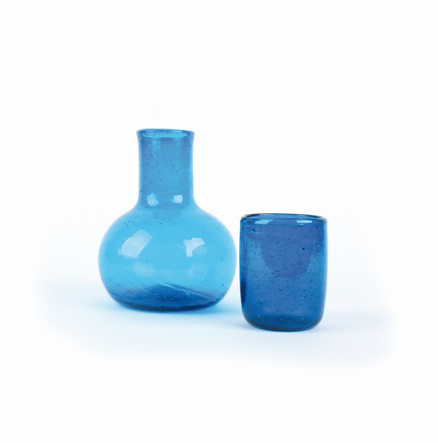Infozeilerecyceltes Glas, 2-teilig, türkis, Karaffe: H 16 cm, Ø 12 cm, Glas: H 8 cm, Ø 6,5 cm, geeignet für die Spülmaschine