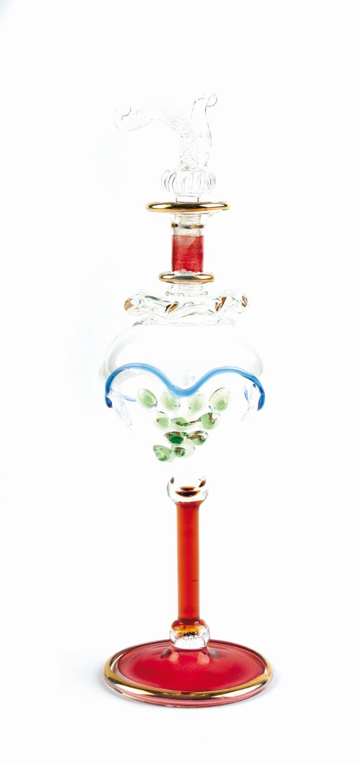 Infozeileverziertes Glas, mundgeblasen, glas/rot/gold/blau H 15 cm mit Verschluss, Ø 5 cm für ca. 50 ml,