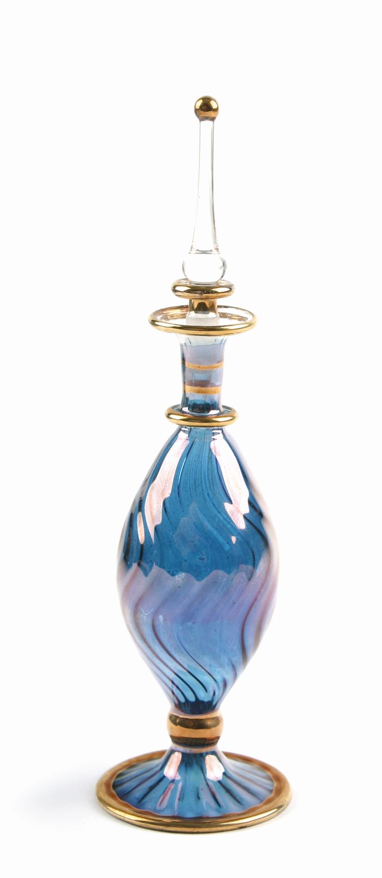 Infozeileverziertes Glas, mundgeblasen, blau/gold, H 15 cm mit Verschluss, Ø 4 cm für ca. 50 ml,