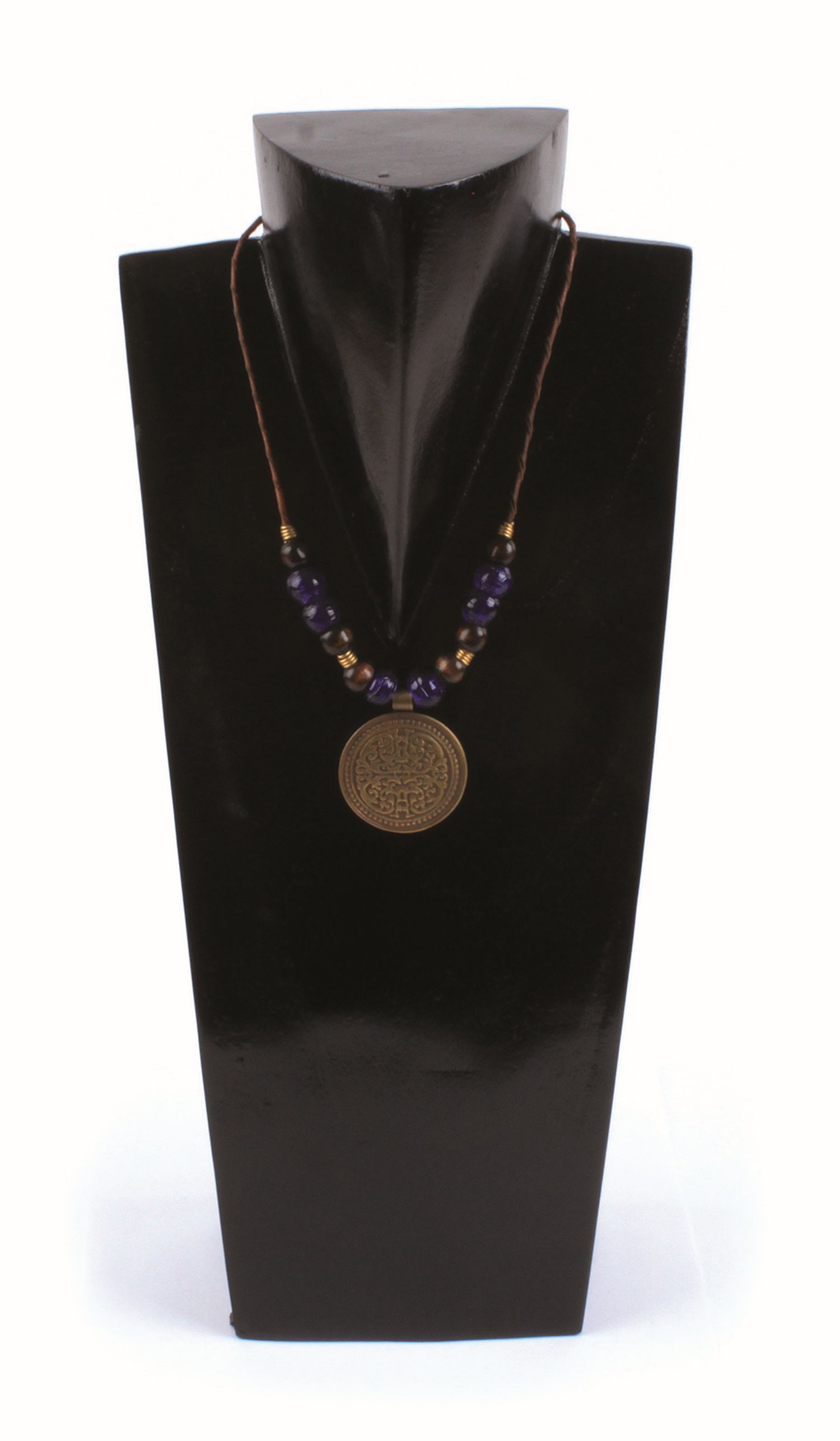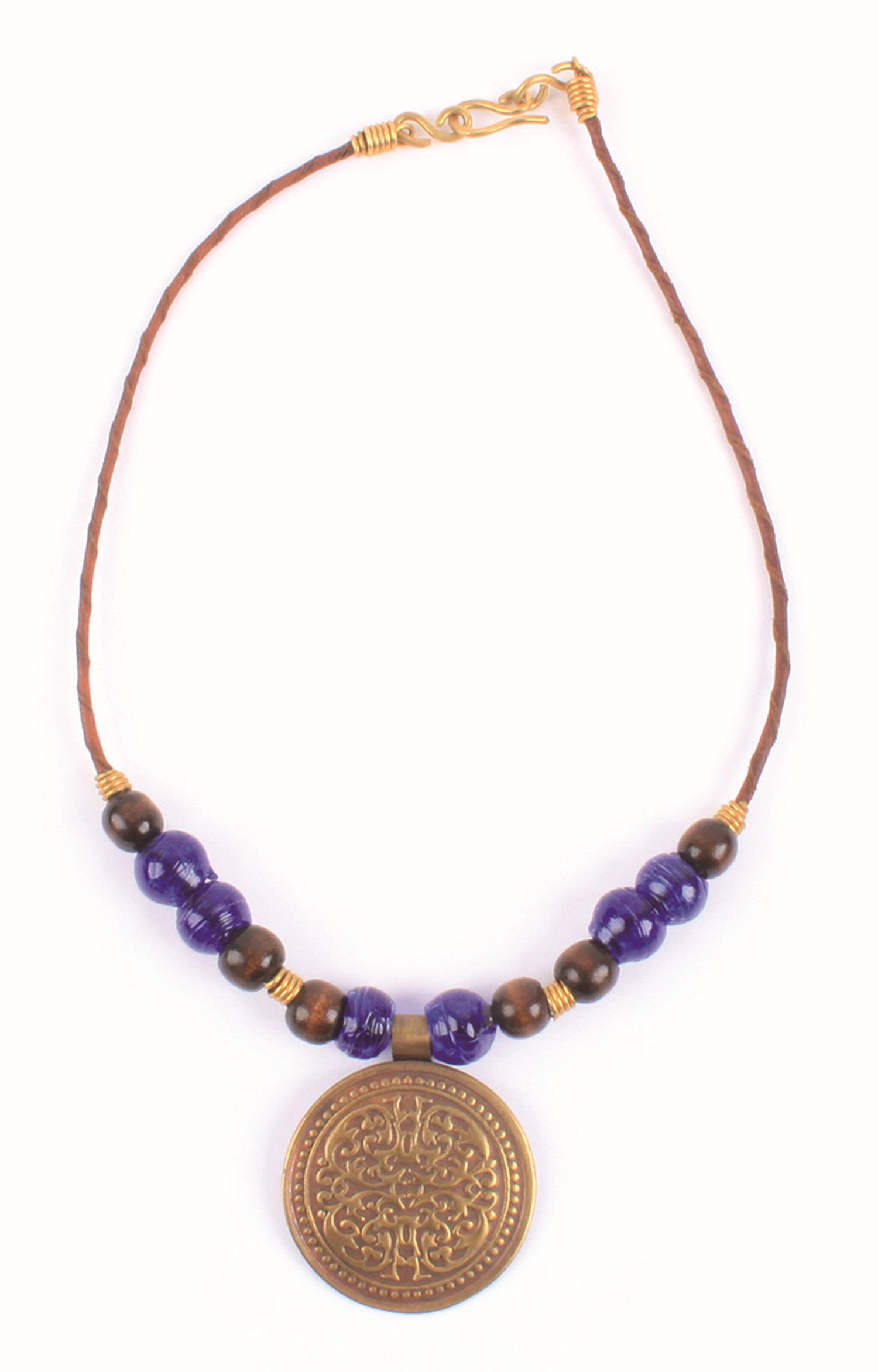 InfozeilePerlen aus recyceltem Glas und Holz, Messing, Band aus gedrehtem Leder, blau/braun, L 43 cm