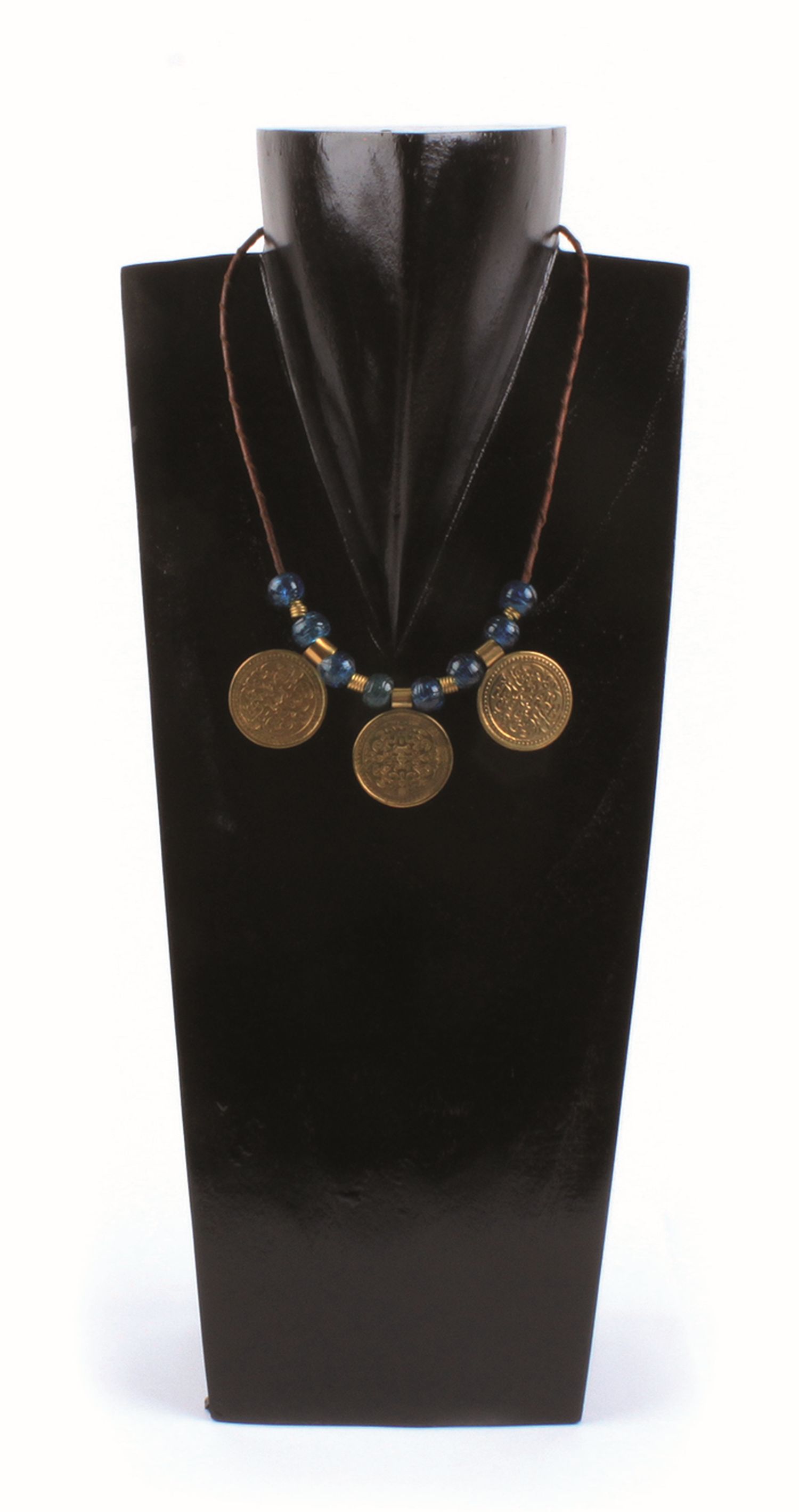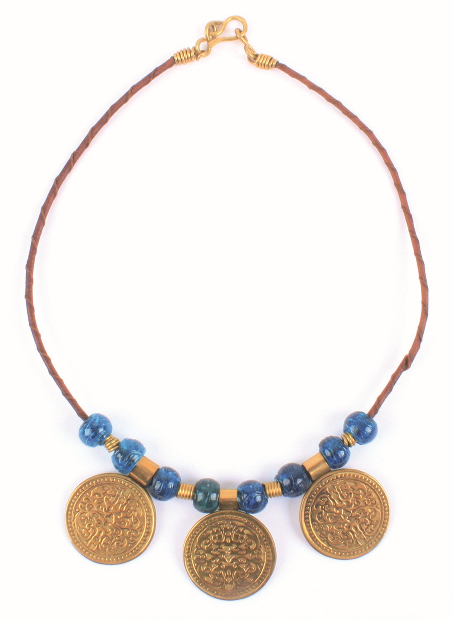 InfozeilePerlen aus recyceltem Glas, Messing, Band aus gedrehtem Leder, türkis, L 44 cm