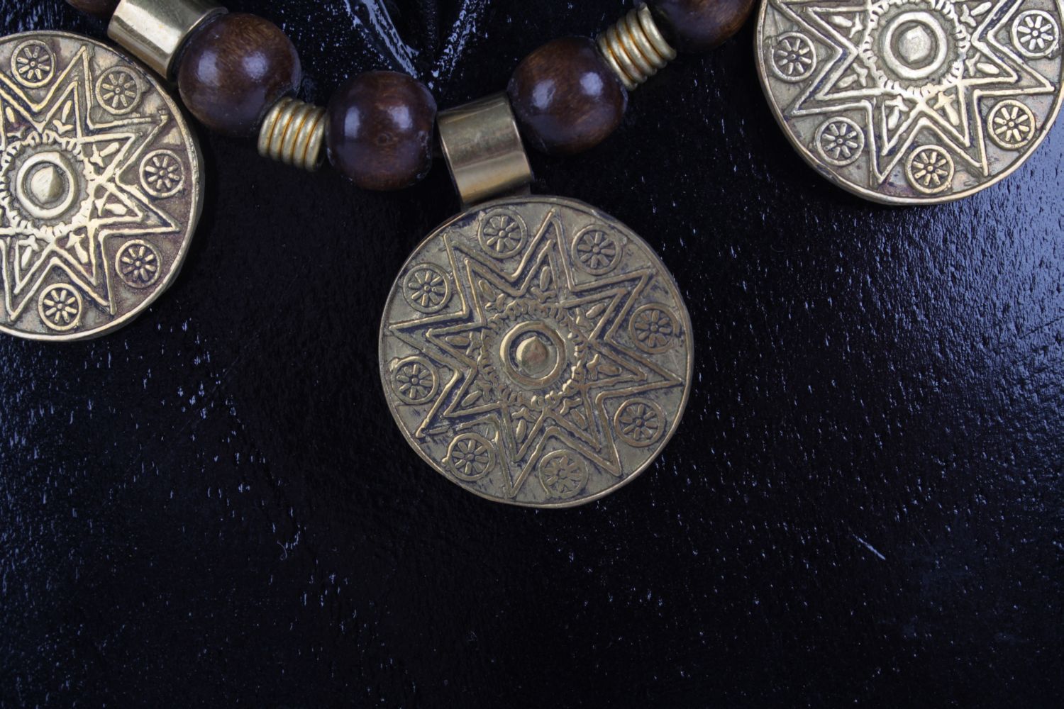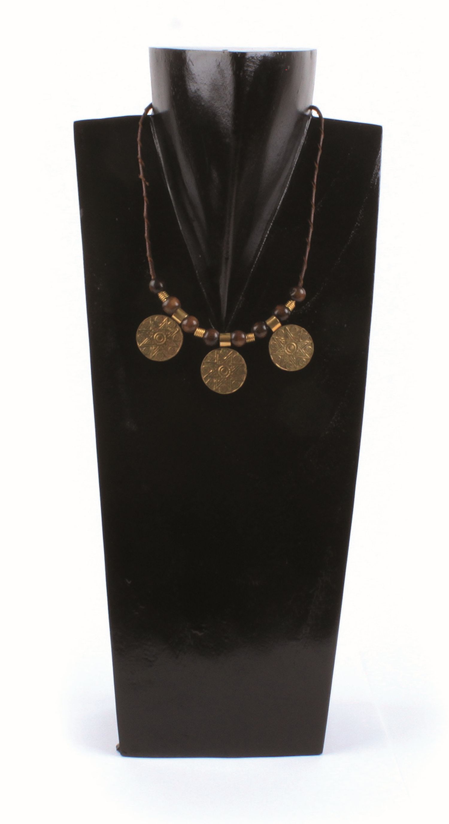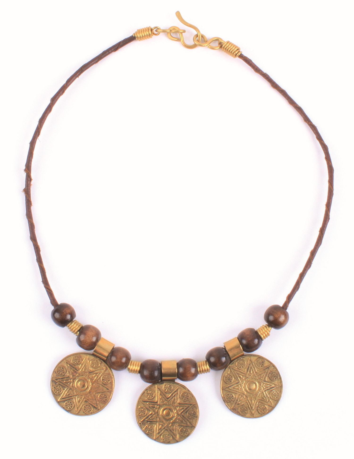 Holzperlen, Messing, Band aus gedrehtem Leder, braun, L 42 cm
