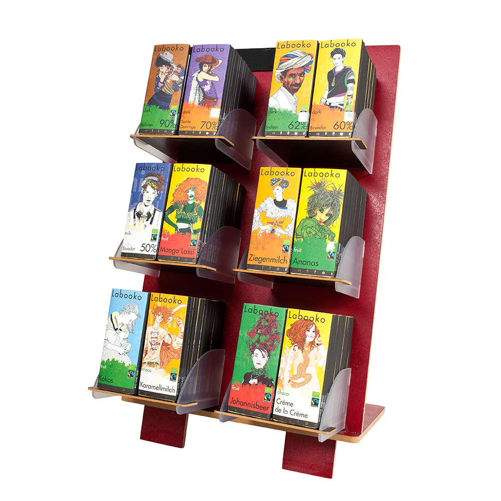 AT1-19-437 Display Zotter, weinrot, Theke hoch, für 12 Sorten LaBooko Schokolade, 33x57,5x21