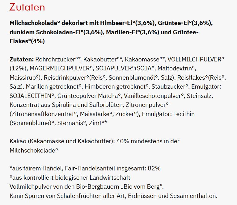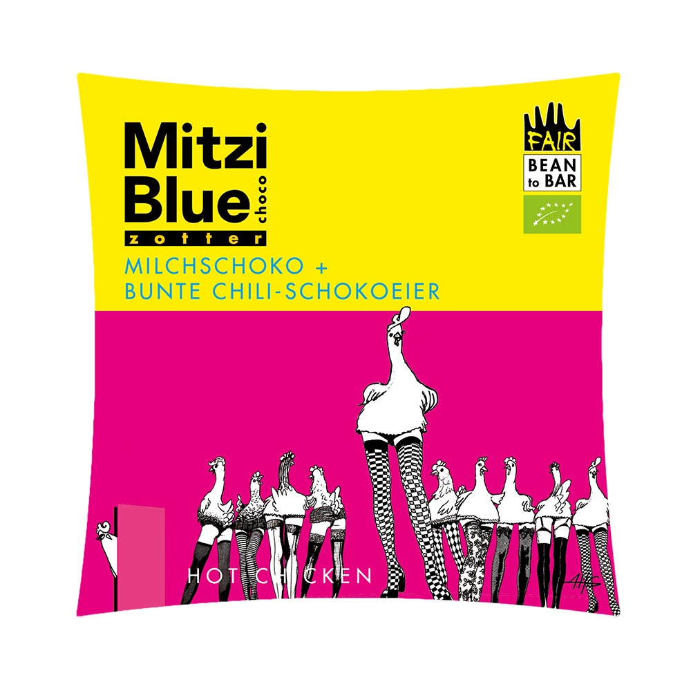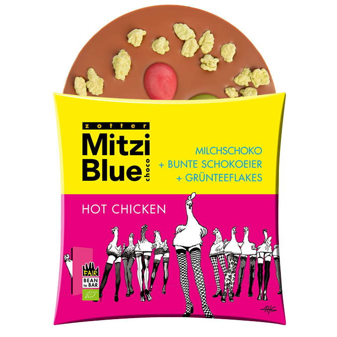 AT1-19-575 Zotter Mitzi Blue "Hot Chicken", Milchschoko + bunte Schokoeier + Grünteeflakes, bio°, 70g