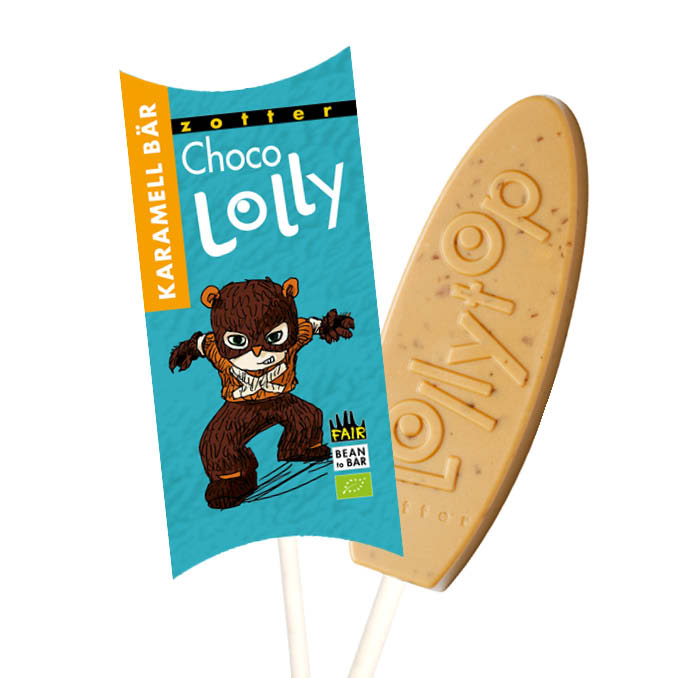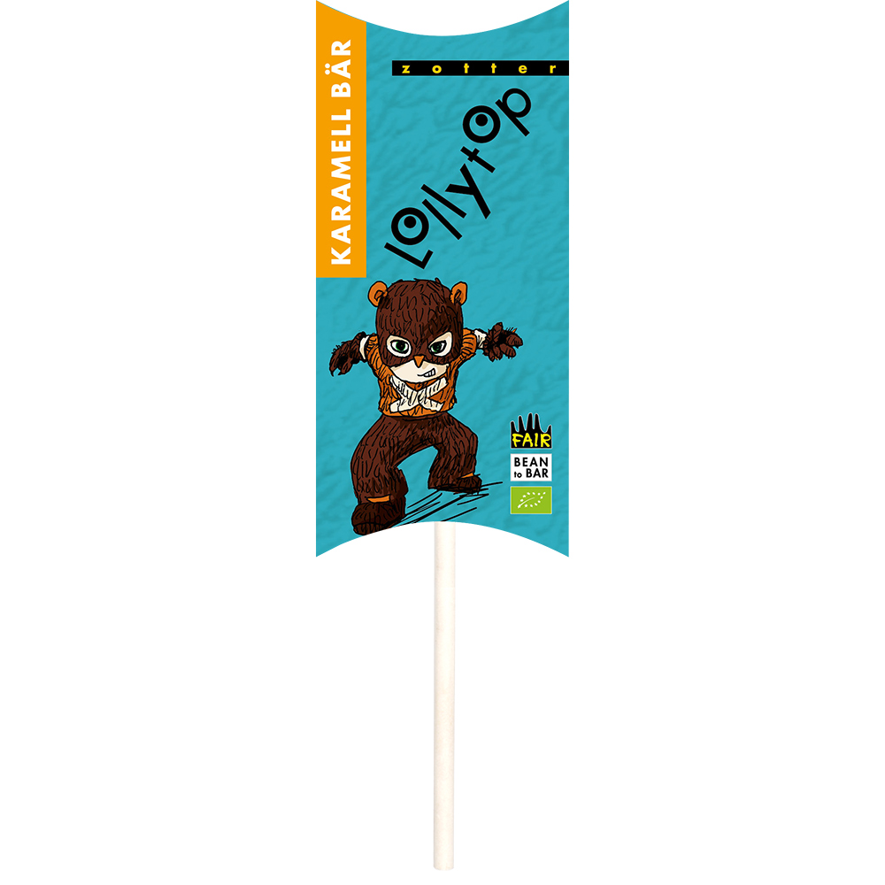 AT1-19-695 Zotter Choco Lolly Karamell-Bär, Schokolutscher am Stiel, 20g, bio°