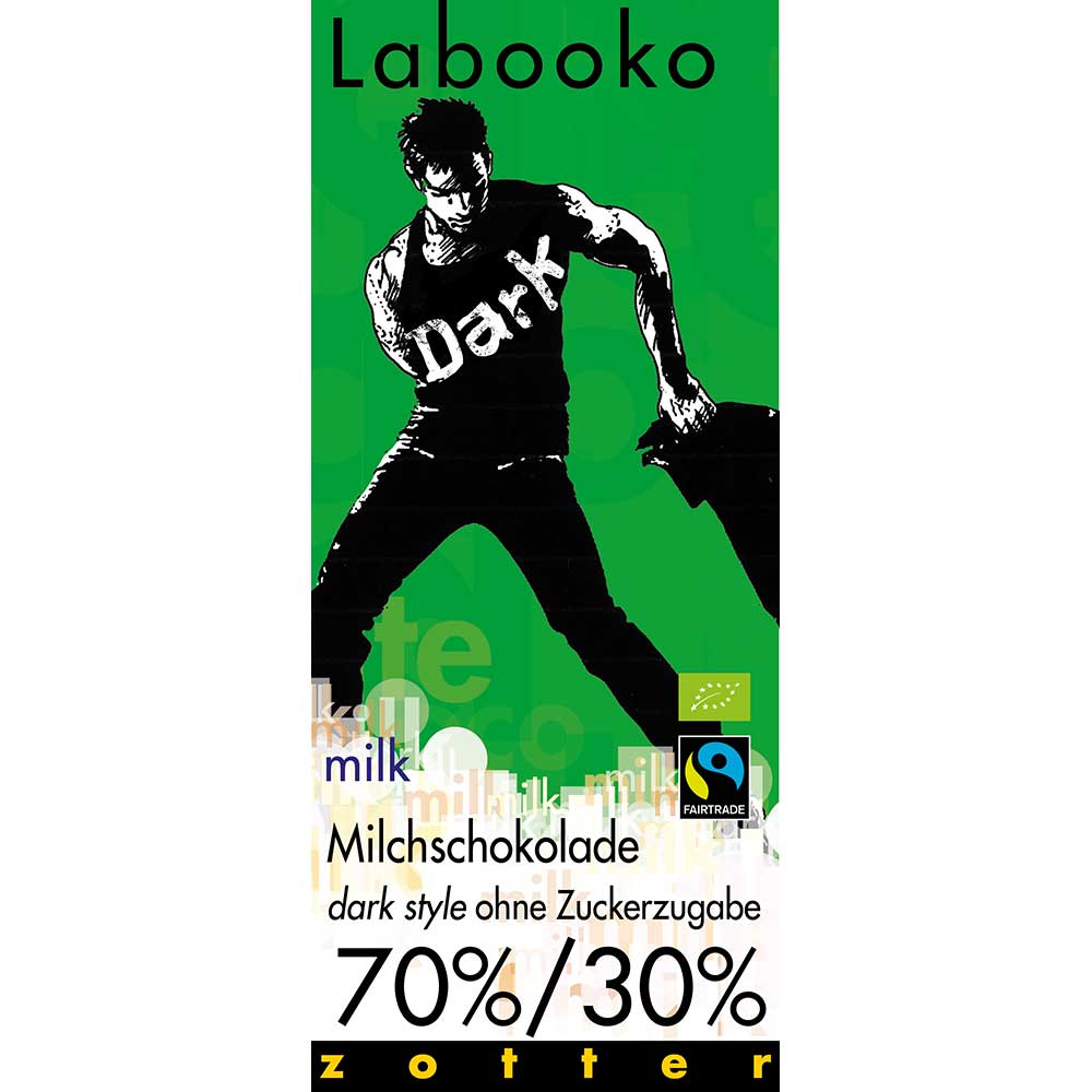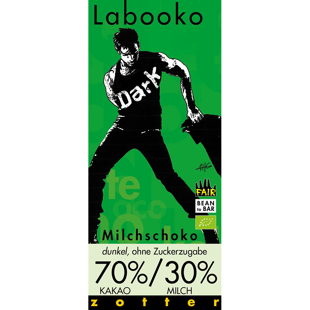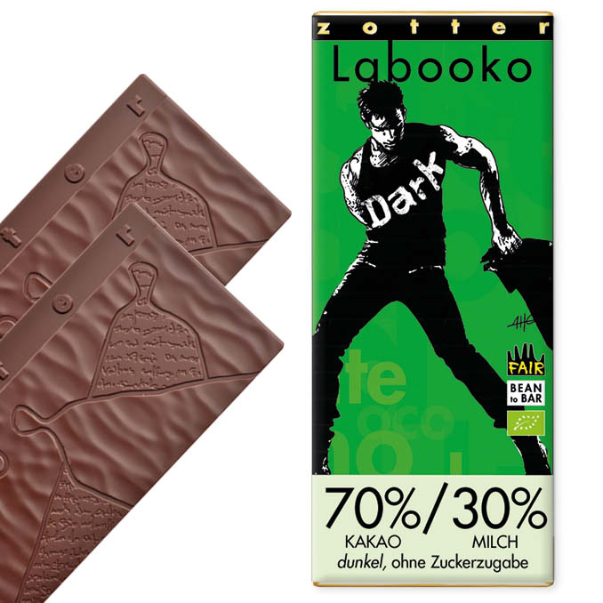 AT1-20-100 Zotter Labooko 70%/30% Kakao-Milch-Tafel, dunkel ohne Zuckerzugabe, bio°, 2x32,5g, zuckeralternativ