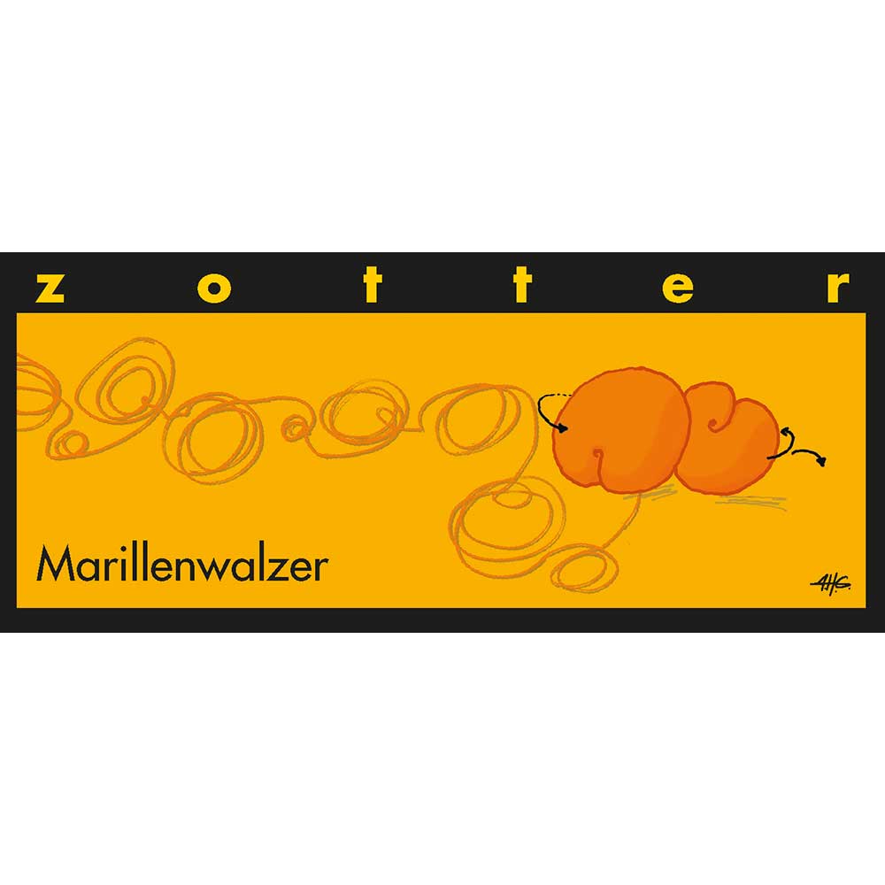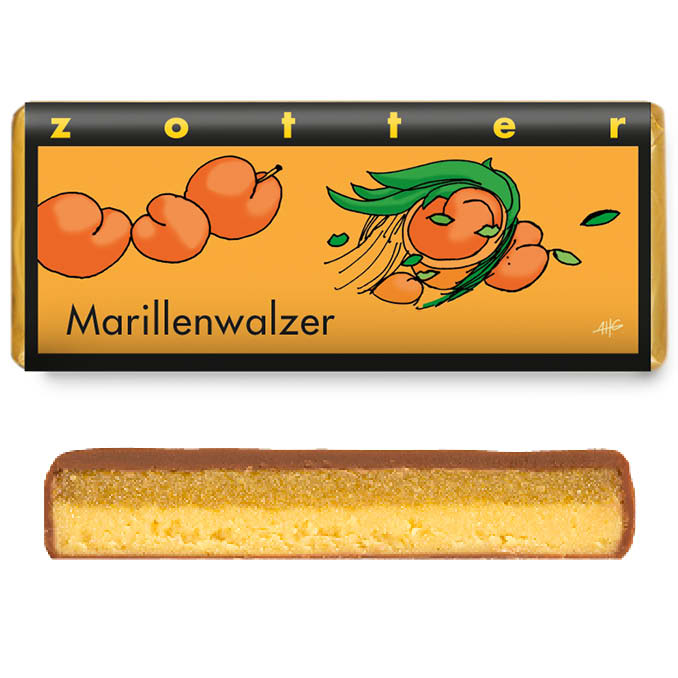 AT1-20-171 Zotter Schokolade Marillenwalzer, bio°, 70g, in 40% heller Bergmilchschokolade, alkoholhaltig