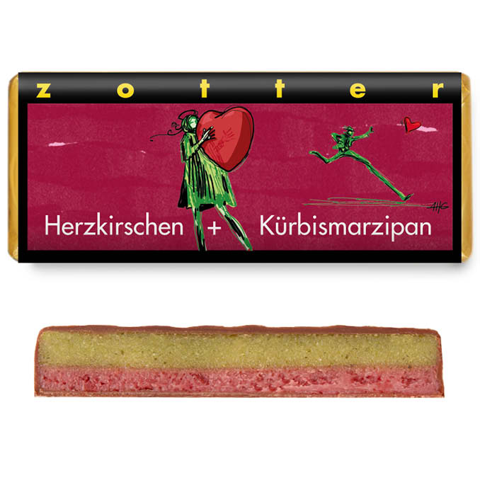 AT1-20-289 Zotter Schokolade Herzkirschen & Kürbiskernmarzipan, bio°, 70g, in 60% extradunkler Bergmilchschokolade