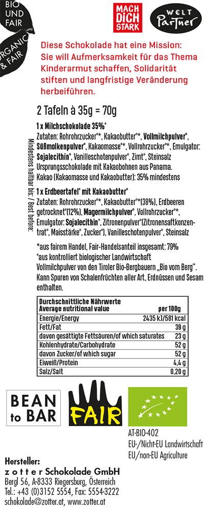 AT1-20-645 Zotter Labooko "Starkmacher-Schokolade", Erdbeere und 35% Milchschoko Panama, bio°, 2x35g