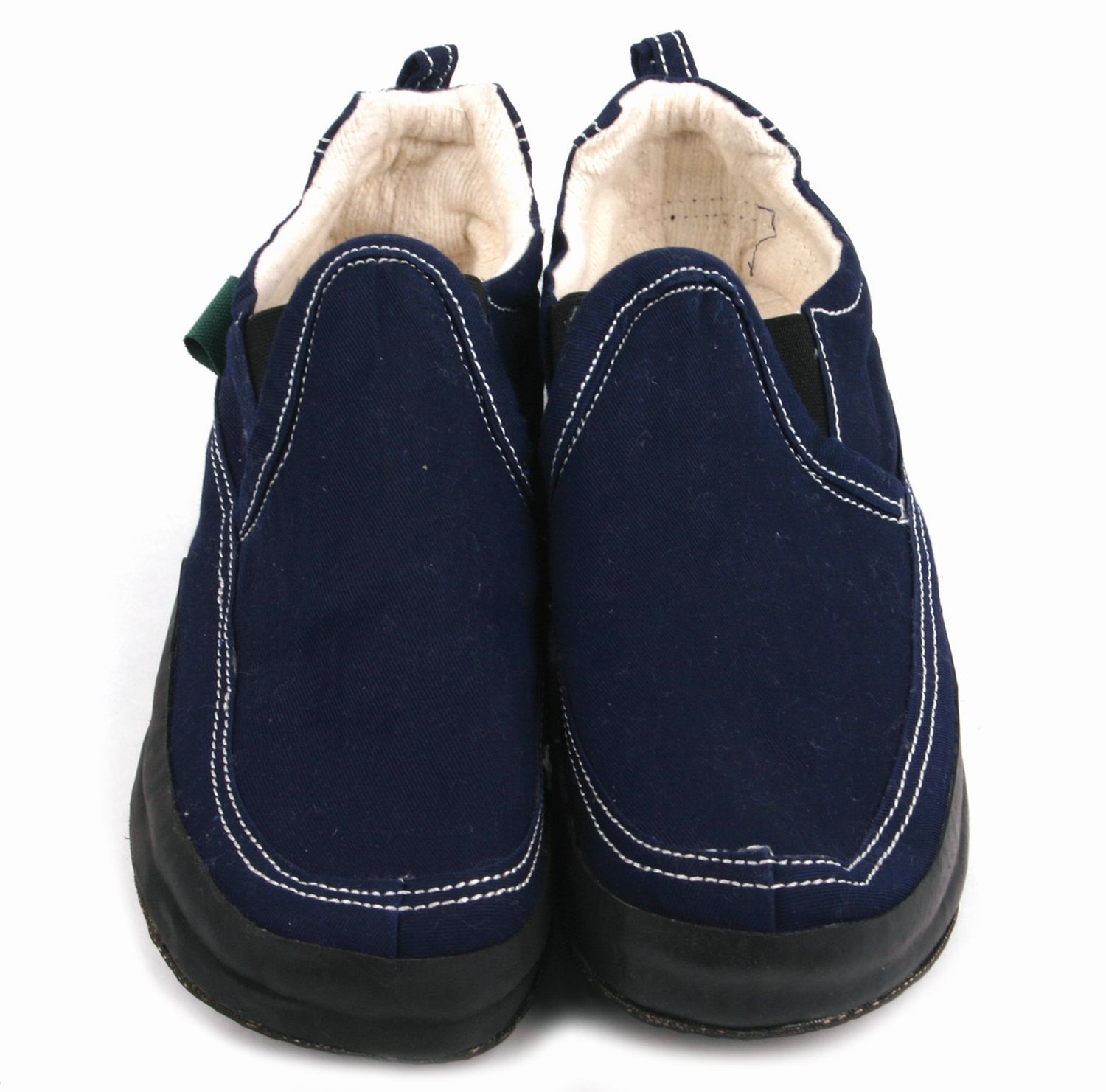 InfozeileBaumwolle mit Gummisohle aus recycl. Autoreifen, im Schuhbeutel, dunkelblau, erhältlich in RESTGRÖßEN 40 bis 45,