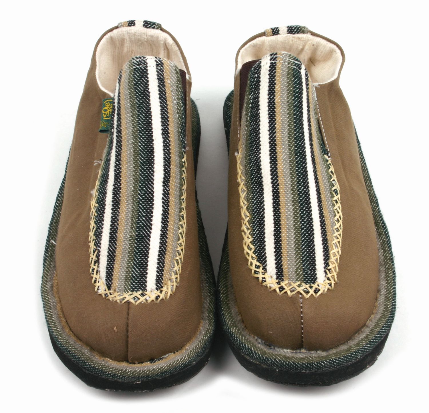InfozeileBaumwolle mit Gummisohle aus recycl. Autoreifen, im Schuhbeutel, olive/gestreift, erhältlich in den Größen 40 bis 45