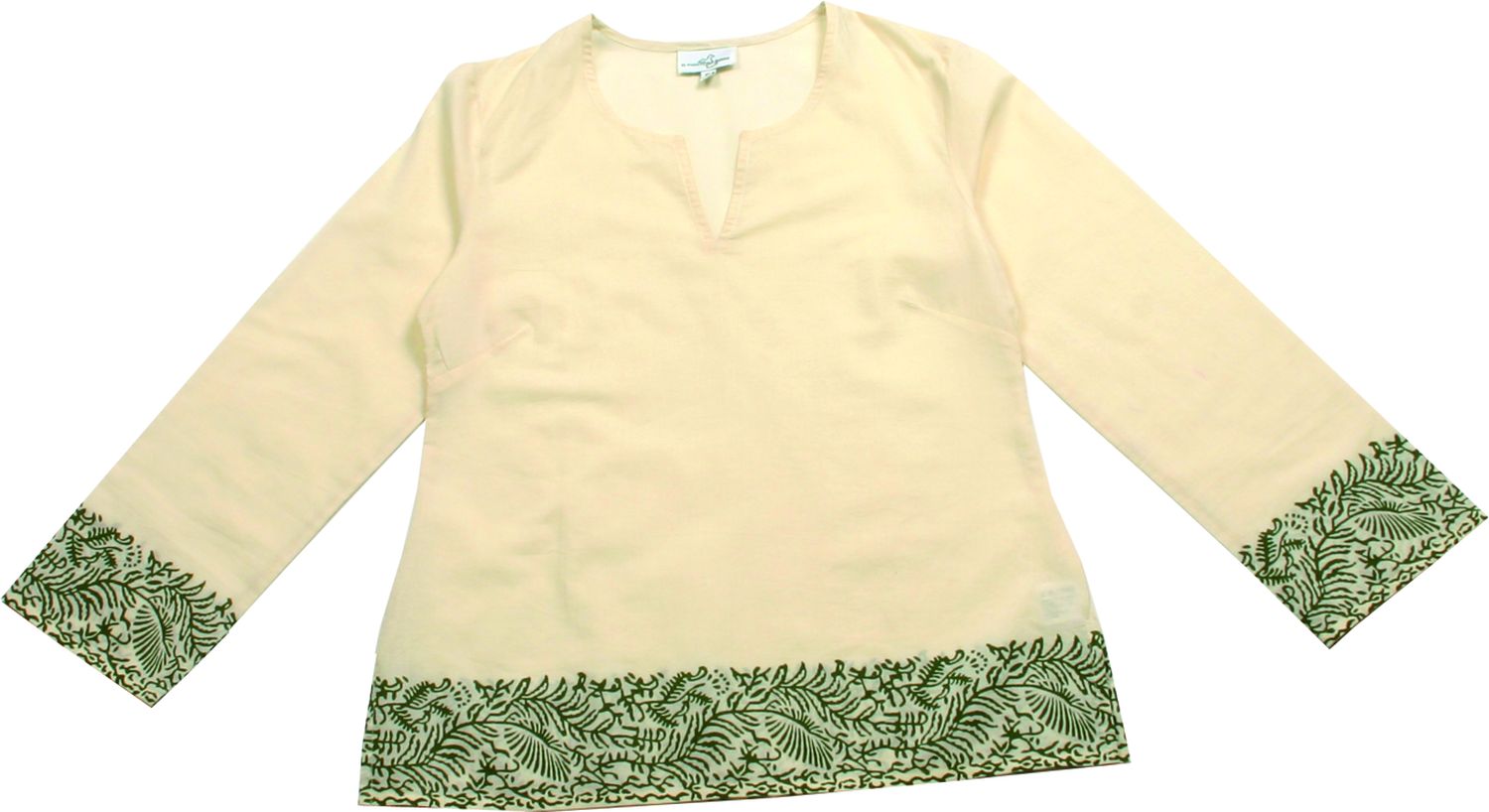 Langarm, beige mit grünem Handdruck, 100% Baumwolle
