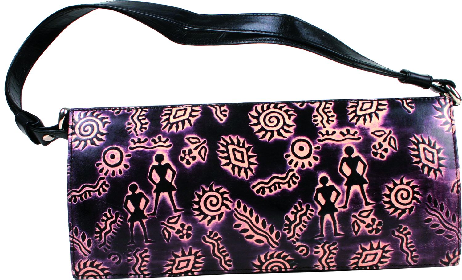mit längenverstellbarem Riemen, Schafsleder, Warli-Design, schwarz/natur, 28 x 4,5 x 13 cm