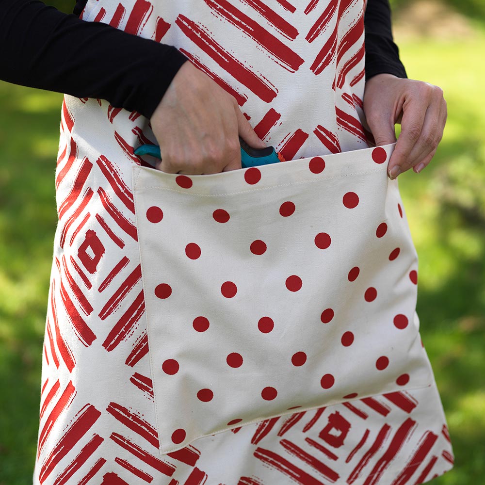 BD7-24-001-03 Schürze, rot bedruckt, handgewebte Bio-Baumwolle, Nackenband L88, 72x78