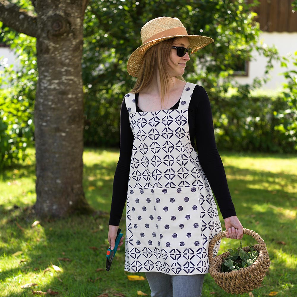 BD7-24-001-10 Schürze, graublau bedruckt, handgewebte Bio-Baumwolle, Nackenband L88, 72x78