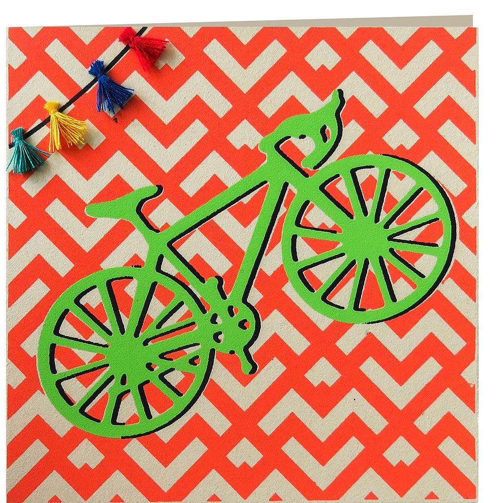 BD7-95-011-03 Grußkarte "Fahrrad", rot mit grünem Fahrrad und Girlande, mit Umschlag, handgeschöpftes Papier (recycelte Jute), 14x14
