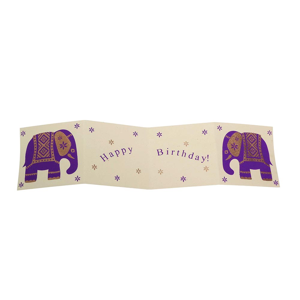 BD7-95-012-09 Faltkarte "Happy Birthday" Elefant, lila, mit Umschlag, handgeschöpftes Papier (recycelte Jute), 11,5x11,5