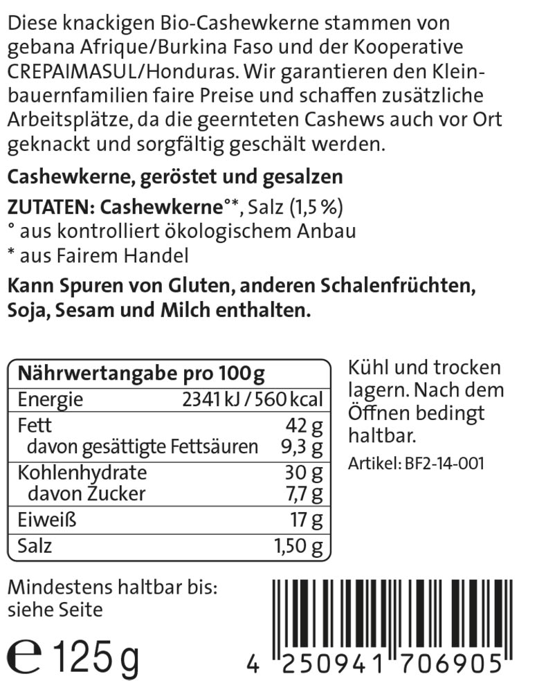 BF2-14-001 Cashew-Kerne, gesalzen, geröstet, bio°, 125g
