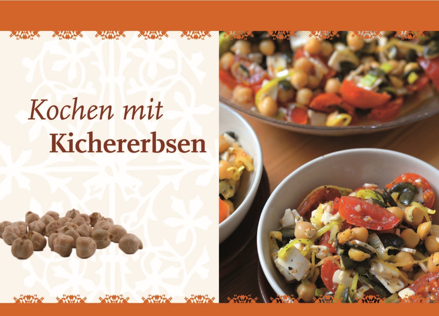 Infozeile"Kochen mit Kichererbsen", 87 Seiten. Es erwarten Sie über 60 Rezepte mit vielen Tipps und Variationen rund um die Kichererbsen!