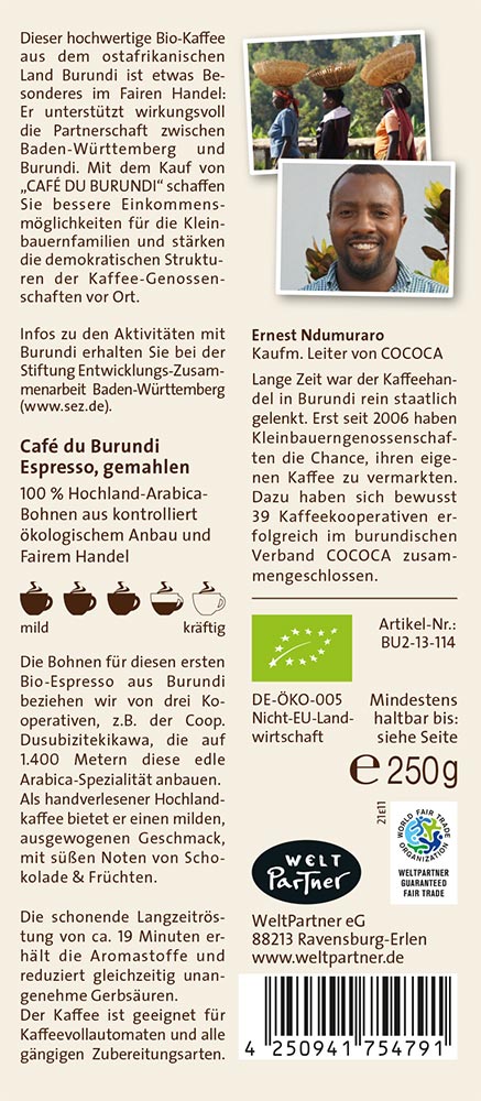 BU2-13-114 Espresso Café du Burundi, gemahlen, bio°, 250g