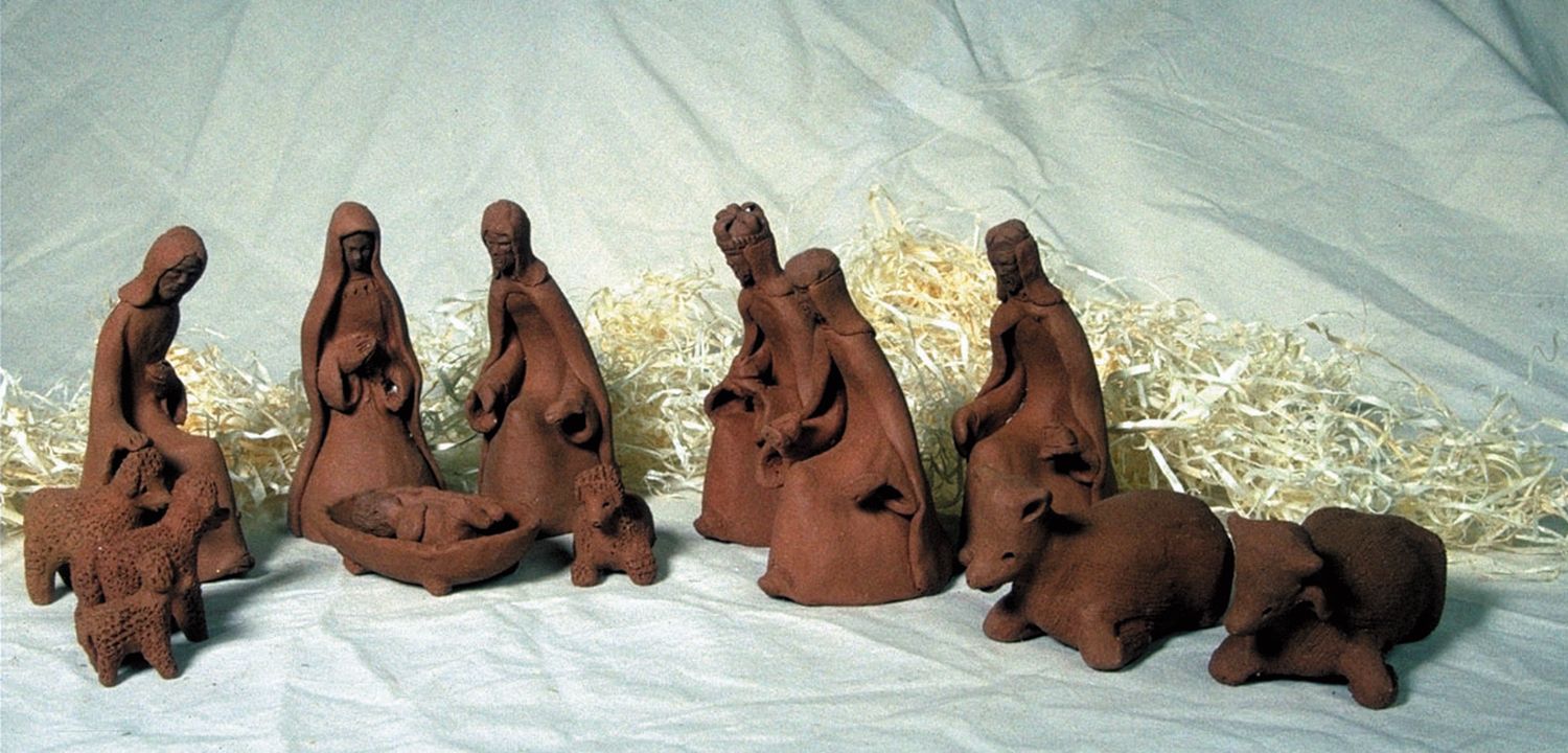 CH1-81-101 13 tlg. Tonkrippe, unglasiert, H 12 cm