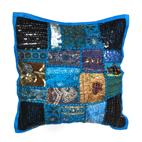 CUS-105 Kissenbezug, Patchwork mit Glasperlen, blau