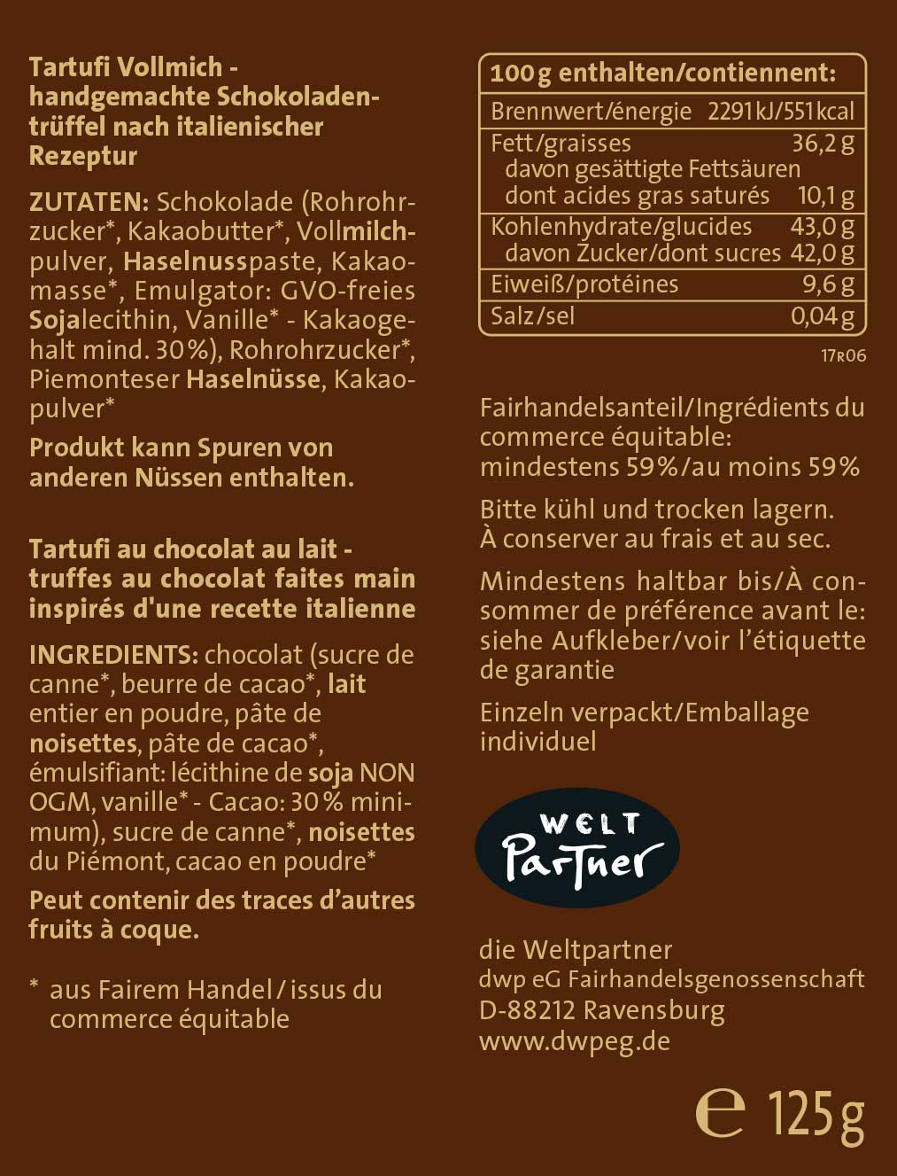 FB4-18-005 Tartufi Vollmilch, handgemachte Schokoladentrüffel, einzeln verpackt, 125g