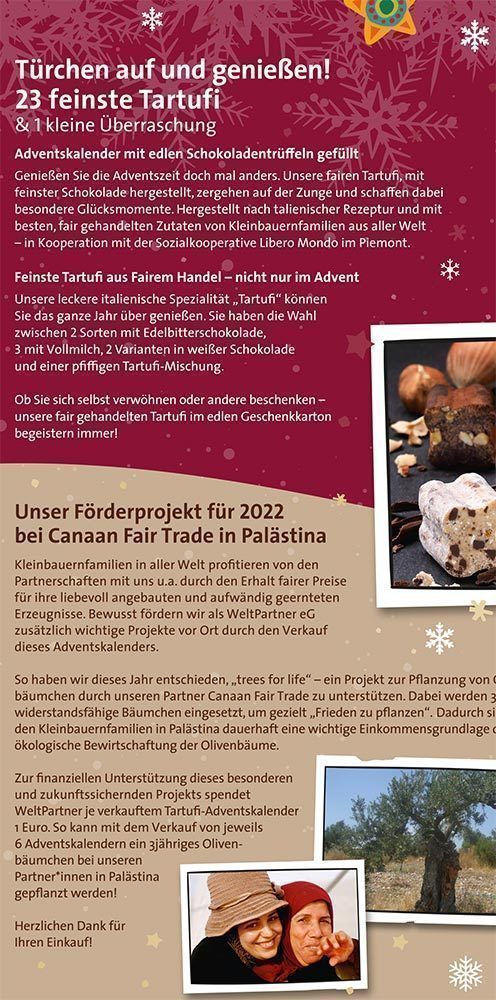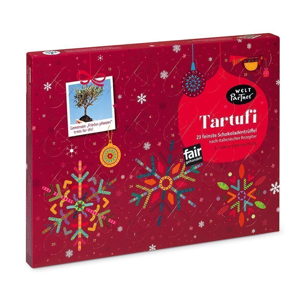 FB4-18-030 Adventskalender Tartufi "Palästina", Schokoladentrüffel, 8 verschiedene Sorten Tartufi, einzeln verpackt, 23 Stück und eine Überraschung, 322g