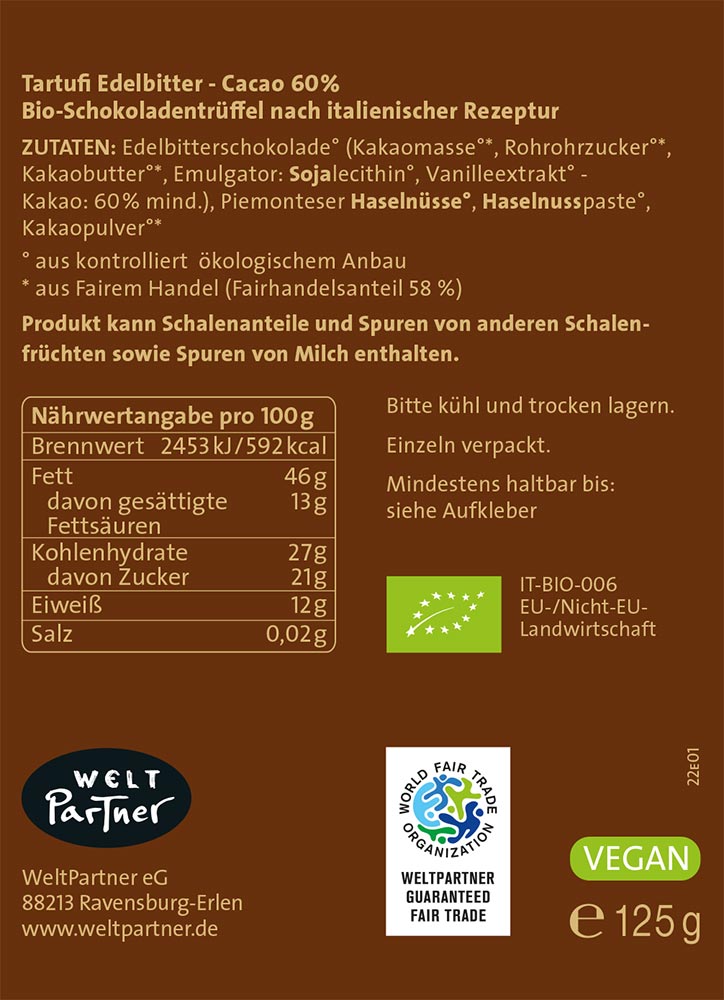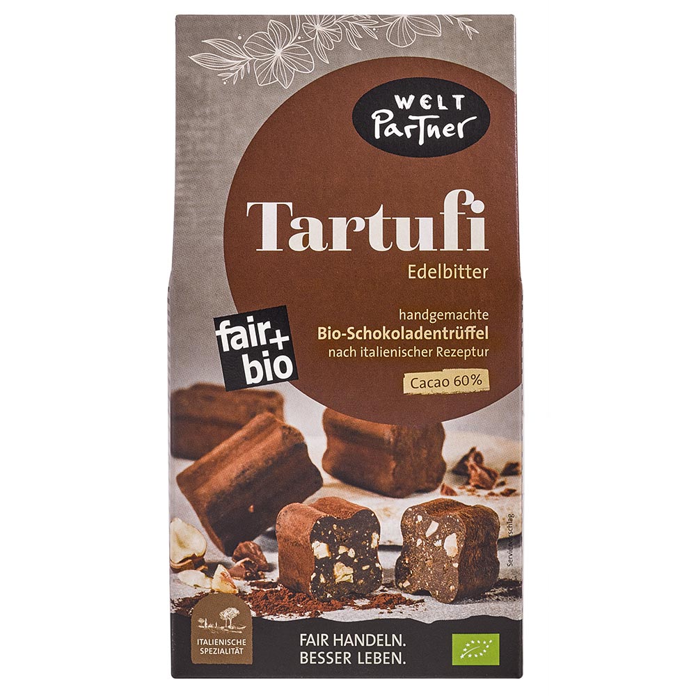 FB4-18-206 Tartufi Edelbitter, Cacao 60%, bio°, handgemachte Schokoladentrüffel, einzeln verpackt, 125g, vegan *Bitte bestellen Sie FB4-18-208*