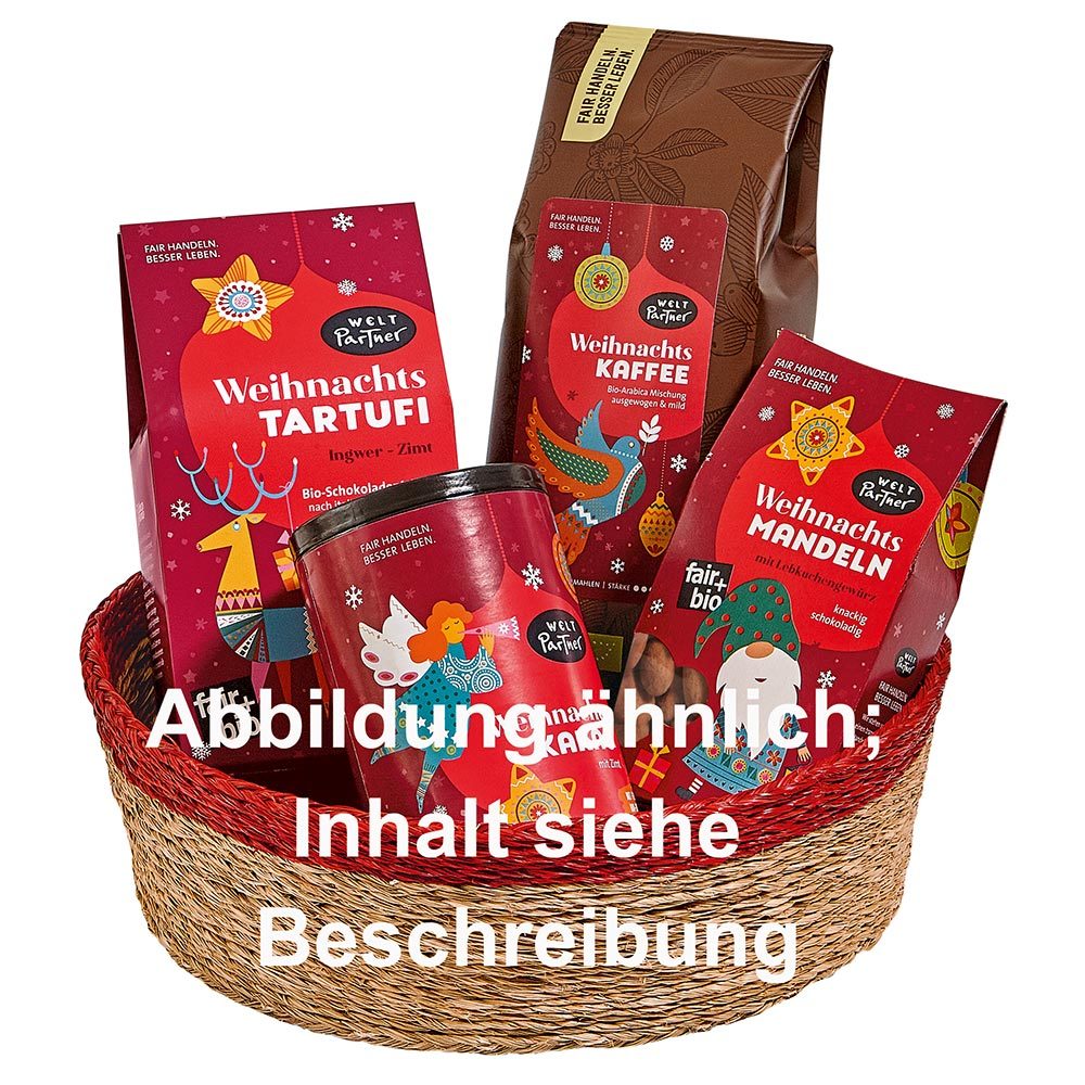 FB5-14-100 Geschenk-Set, Korb S, mit 3 fair+bio Weihnachtsprodukten - 4 Einzelprodukte als Set im Versandkarton