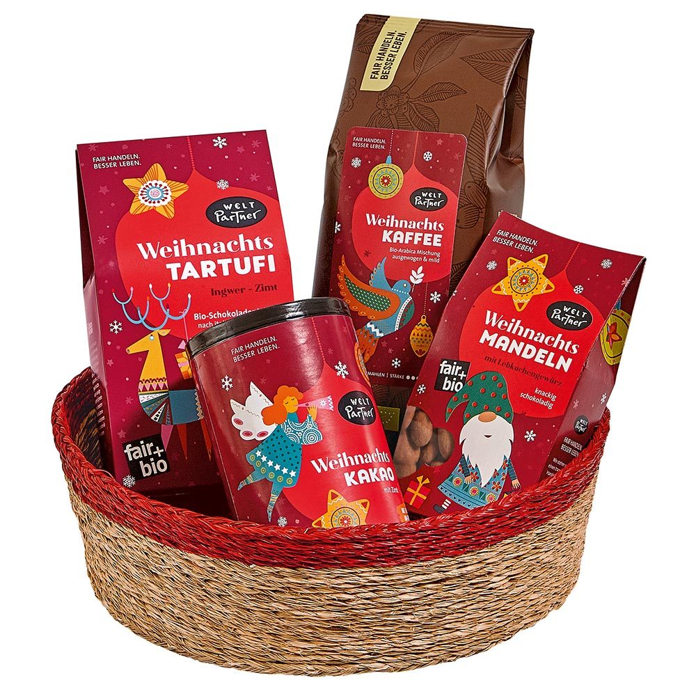 FB5-14-101 Geschenk-Set, Korb M, mit 4 fair+bio Weihnachtsprodukten - 5 Einzelprodukte als Set im Versandkarton