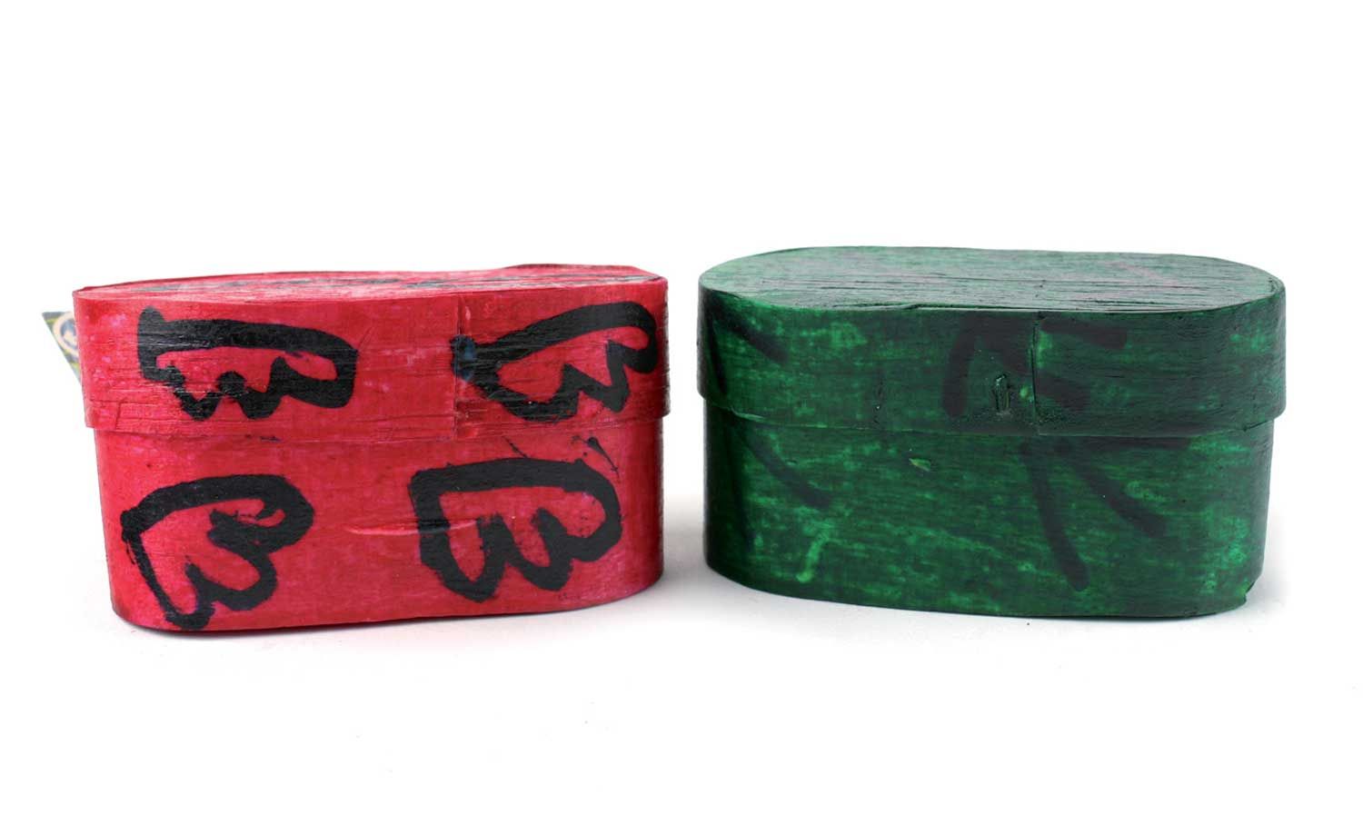 InfozeileSchachtel: bemaltes Holz, 10 x 5,5 cm, Puppen: Holz mit Baumwolle, verschiedene Farben, 2,5 x 5,5 cm