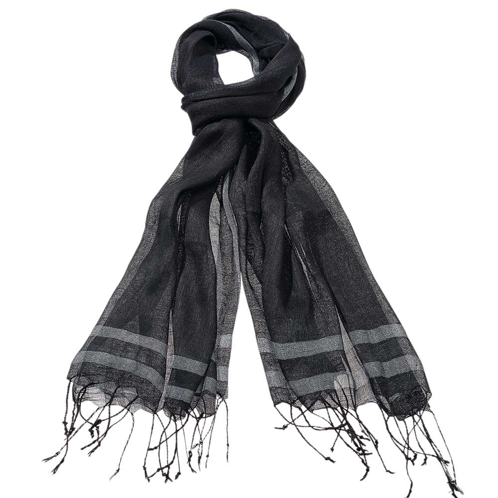 IN0-22-085 Schal, handgewebt, mit Streifen, schwarz/grau, mit gedrehten Fransen, Leinen/Viskose (80/20), 65x180