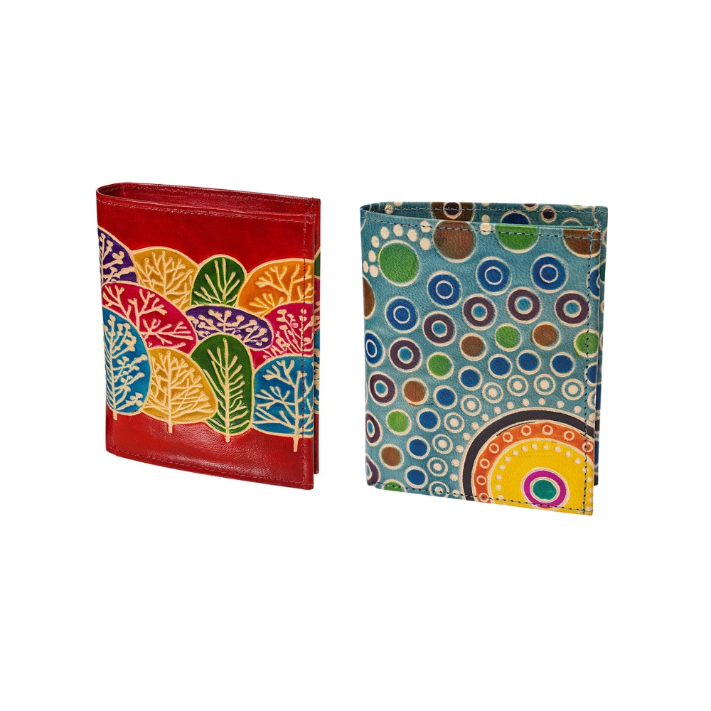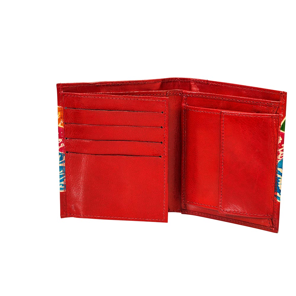IN0-25-104-03 Geldbeutel "Herbst" mit Münz- und Scheinfach, Druckknopfverschluss innen, Bunte Bäume/rot, Ziegenleder, 10,5x12,5