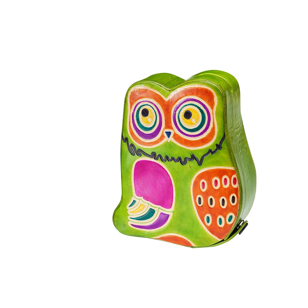 IN0-27-008 Spardose "Eule", mit Druckknopfverschluss, grün mit orange/lila, Ziegenleder, 12x14x4