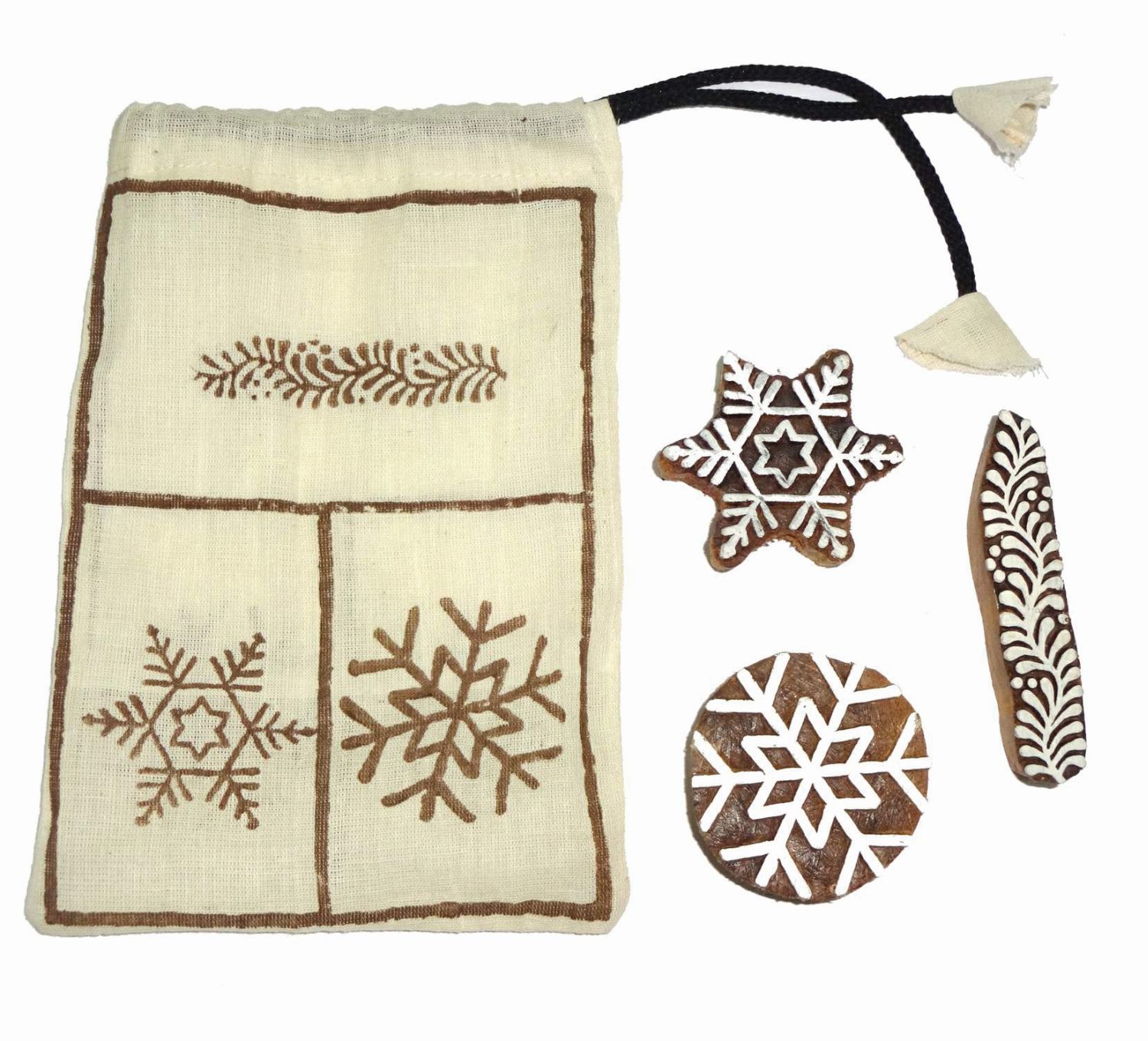 Infozeile3er-Set im Stoffsäckchen, Schneeflocke, Stern und Zweig, Sheesham-Holz, ca. 5 x 5 und 1 x 9 cm