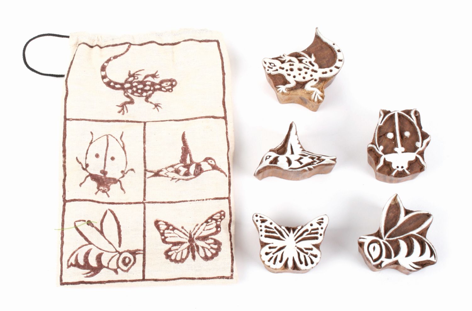 Infozeile5er-Set im Stoffsäckchen, Vogel, Biene, Käfer, Schmetterling, Eidechse, Sheesham-Holz, ca. 4 x 5 cm