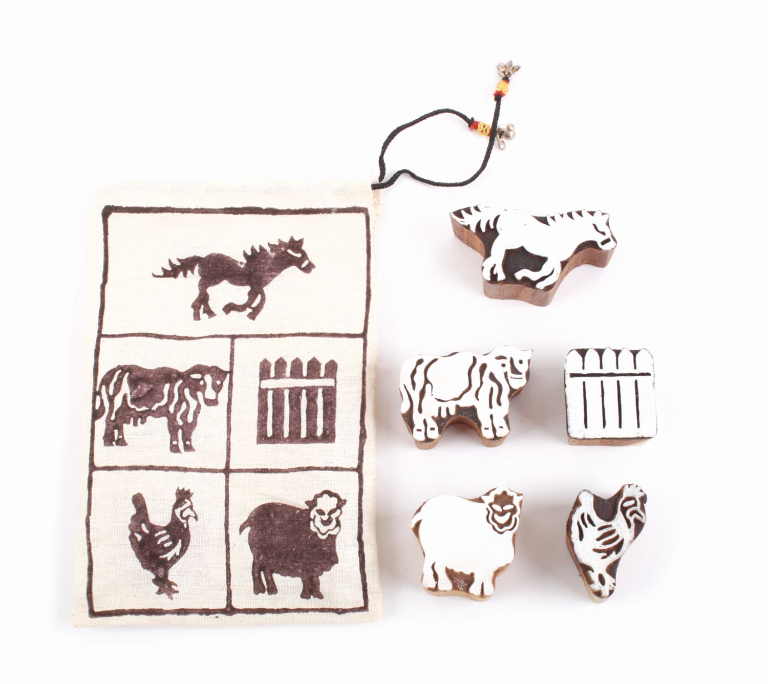 5er-Set im Stoffsäckchen, Bauernhof, Sheesham-Holz, ca. 4 x 5 cm