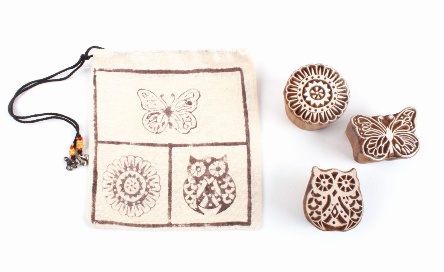 Infozeile3er-Set im Stoffsäckchen, Schmetterling, Blume, Eule, Sheesham-Holz, ca. 4 x 5 cm