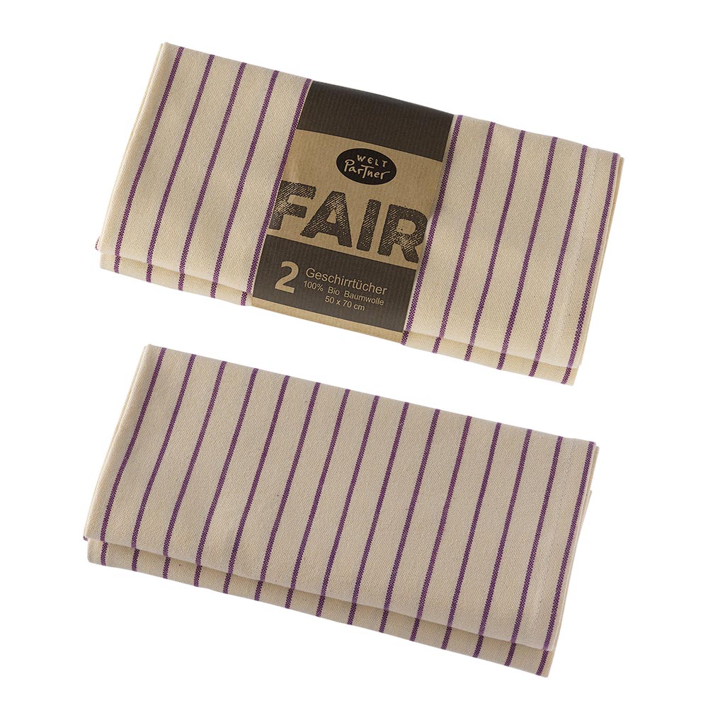 IN1-83-010-09 Geschirrtücher, 2er-Set, mit schmalen Streifen, naturweiß/lila, handgewebt, Bio-Baumwolle, 70x50
