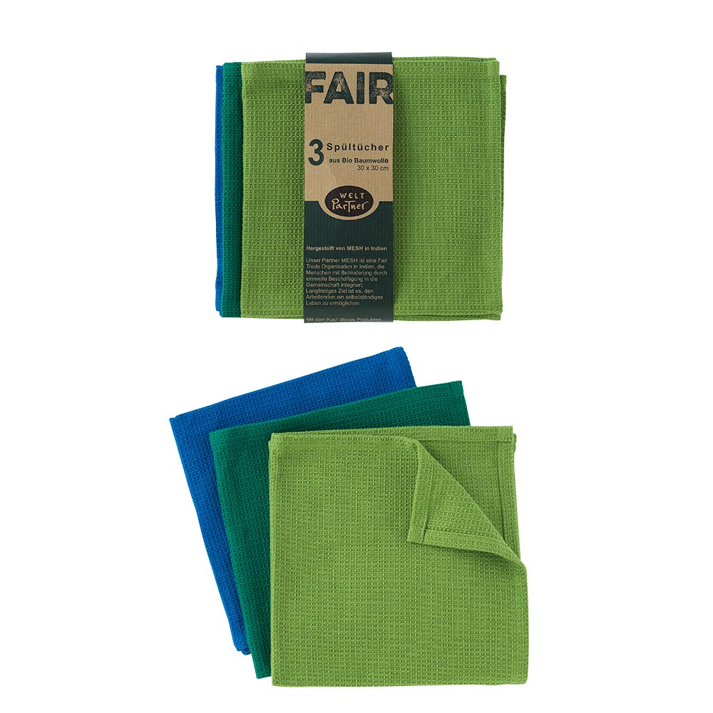 IN1-83-011-04 Spültücher, 3er-Set, Waffelgewebe, königsblau/wiesengrün/tannengrün, Bio-Baumwolle, 30x30